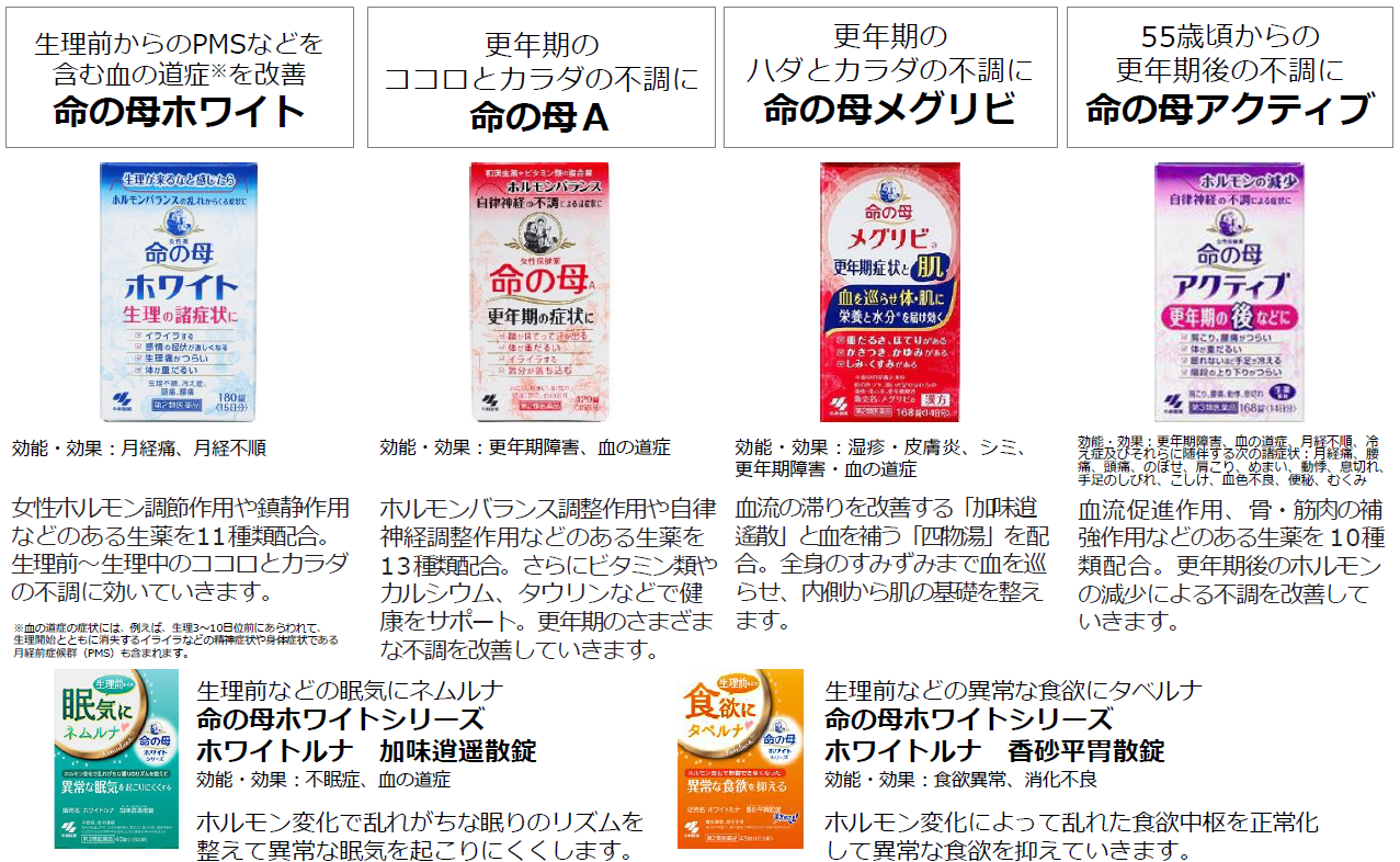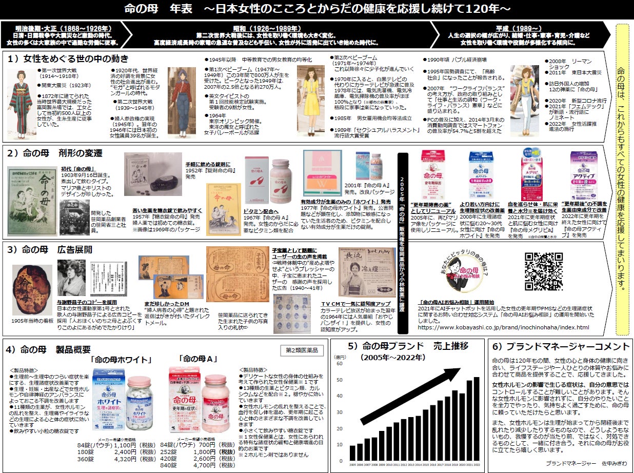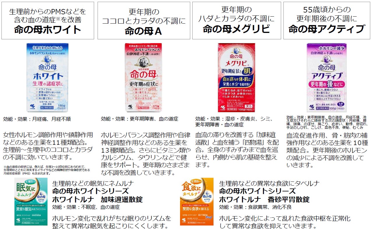 ◇令和:現在では、更年期症状を改善する「命の母A」、PMSなどを含む血の道症※を改善する「命の母ホワイト」に加え、更年期の後などの不調を改善する「命の母アクティブ」など、女性の50年に寄り添うブランドとしてラインアップを拡充しています。