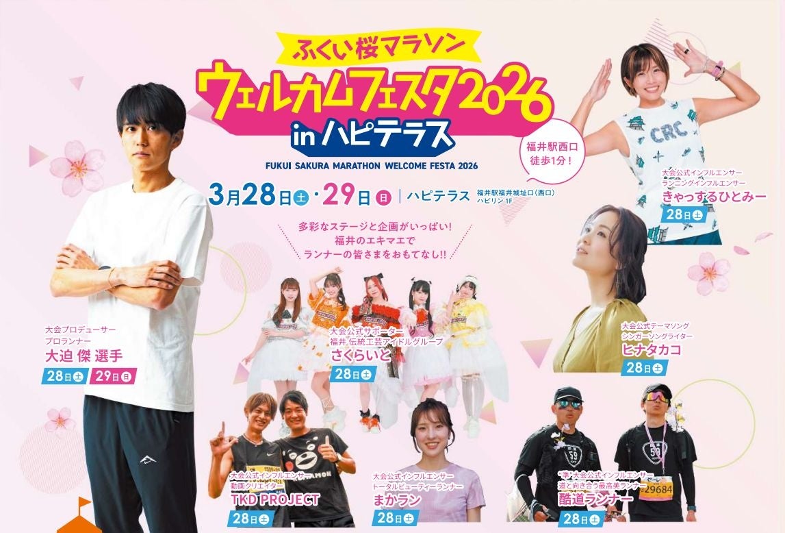 福井駅前で、ランナーの皆さまをおもてなしする「ふくい桜マラソン ウェルカムフェスタ2026」が開催されます。本イベントは、ランナーはもちろん一般の方も大歓迎です。見どころは、大会プロデューサーでありプロランナーの大迫傑選手が両日登場し、トークショーを行います。また、28日には、大会公式サポーターの福井伝統工芸アイドルグループ「さくらいと」や、大会公式テーマソングを歌うシンガーソングライター「ヒナタカコ」さんによるミニライブも開催されます。