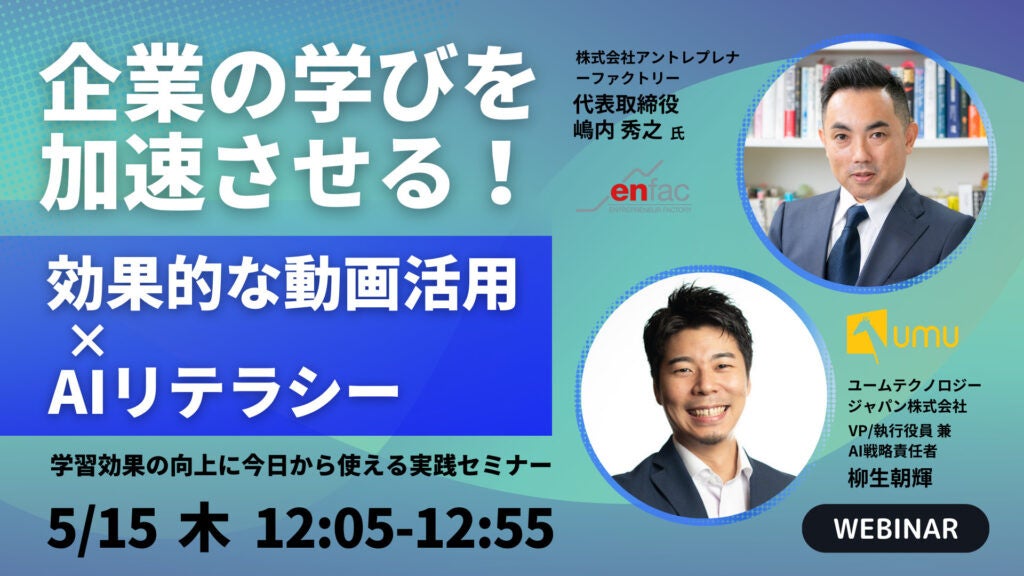 ユームテクノロジージャパン株式会社(本社:東京都新宿区、代表取締役:松田しゅう平、https://www.umujapan.co.jp)は、株式会社アントレプレナーファクトリー(本社:大阪府大阪市、代表取締役 嶋内秀之)と共同で、「企業の学びを加速させる!効果的な動画活用 × AIリテラシー 〜学習効果の向上に今日から使える実践セミナー〜」と題するオンラインセミナーを、2025年5月15日(木)12:05〜より開催いたします。