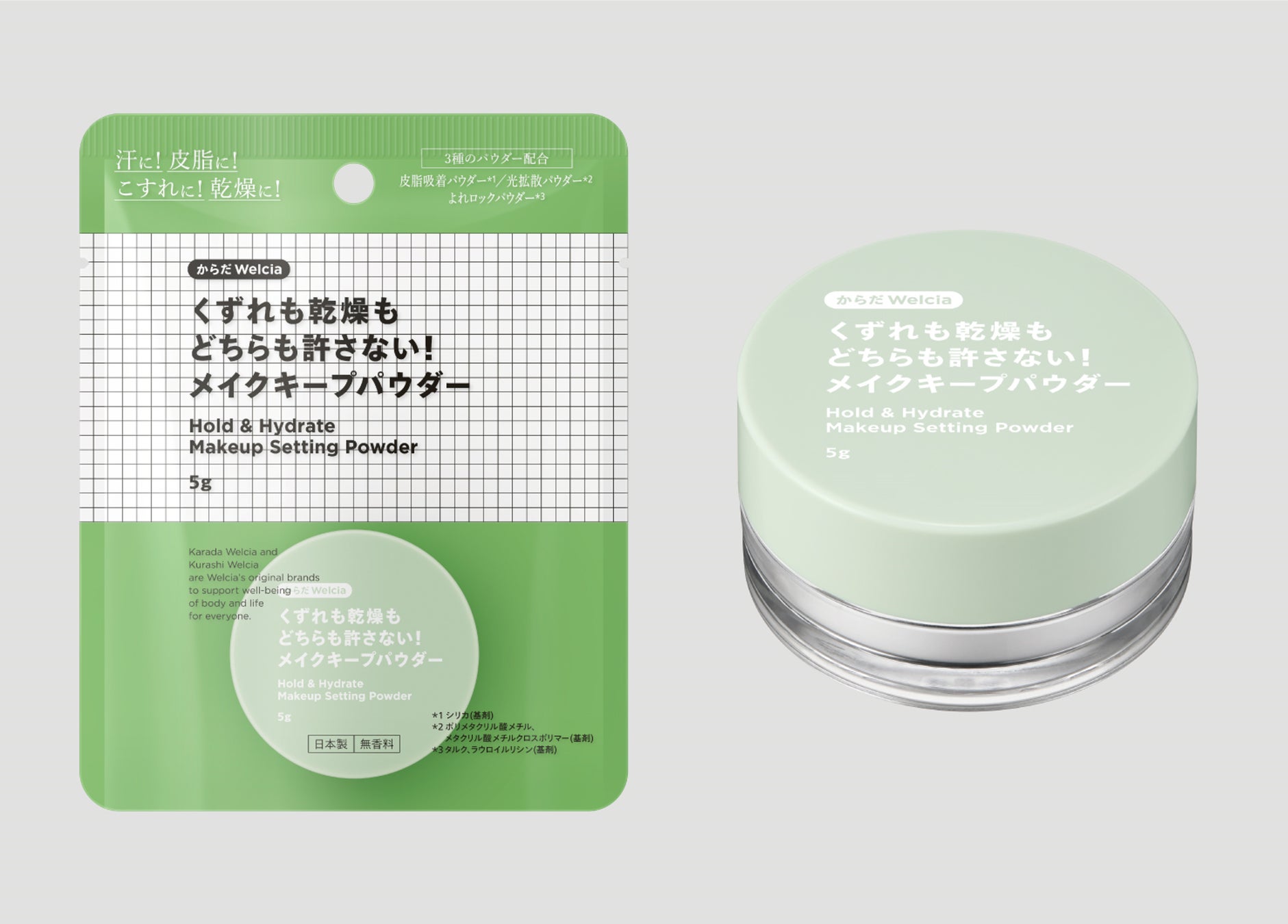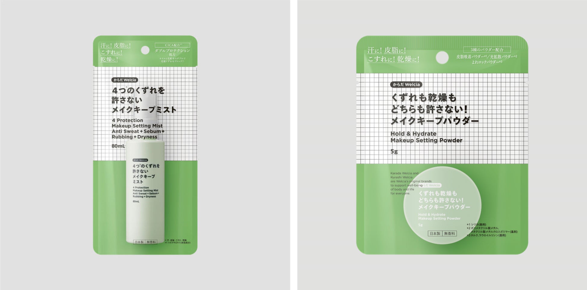 近年の猛暑をきっかけに、多くの方がメイクの仕上げに取り入れている「メイクキープアイテム」。 夏は汗や皮脂によるくずれが気になりますが、室内の冷房により実は夏でも「乾燥」くずれも起こりがち。メイクくずれの主な4つ「汗・皮脂・こすれ・乾燥」からメイクをキープするミストとパウダーを、からだWelciaのビューティ商品のコンセプトである「クリーンビューティ」を軸に開発しました。メイクくずれを防止することができ、春夏秋冬いつでもお使いいただけます。