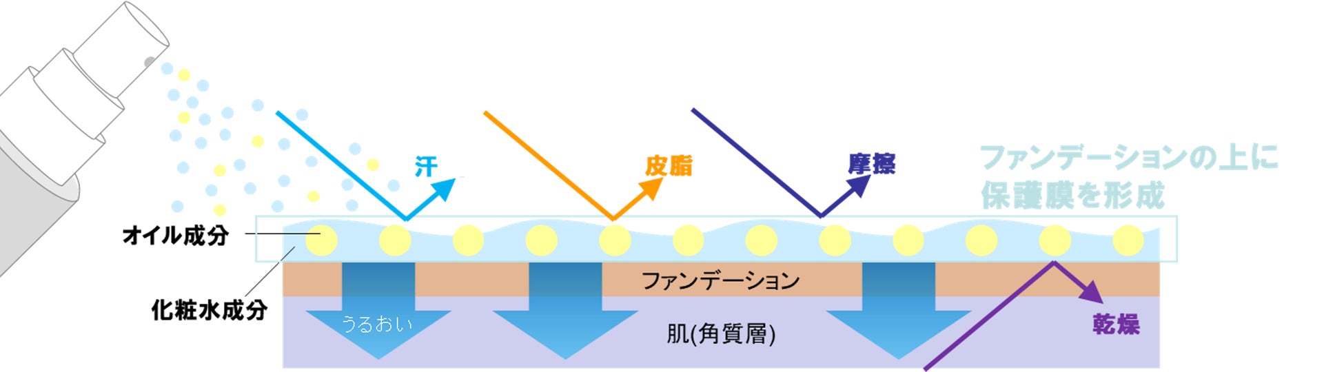 化粧水とオイルの2層が織りなす「ダブルプロテクション処方」により、ミストが保護膜を形成し、汗・皮脂・こすれ・乾燥によるメイクくずれを予防します。
