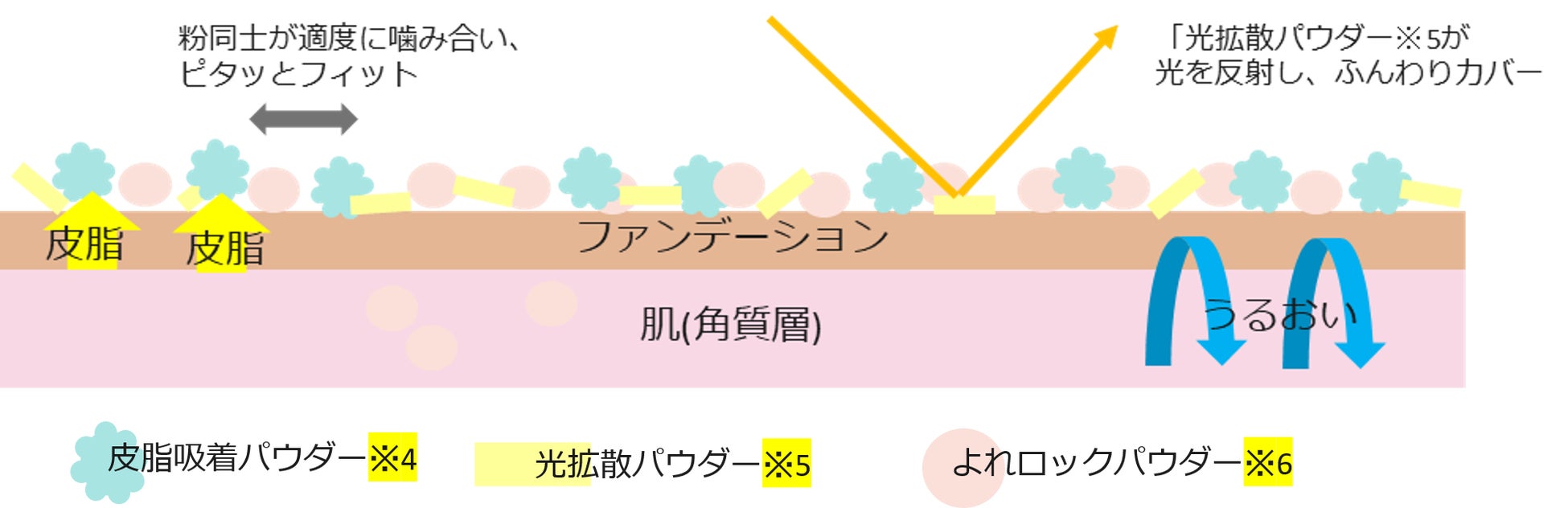 皮脂吸着パウダー※4、光拡散パウダー※5、よれロックパウダー※6の3種のパウダーの密着ベールにより、皮脂吸着・お直し効果をもたらします。