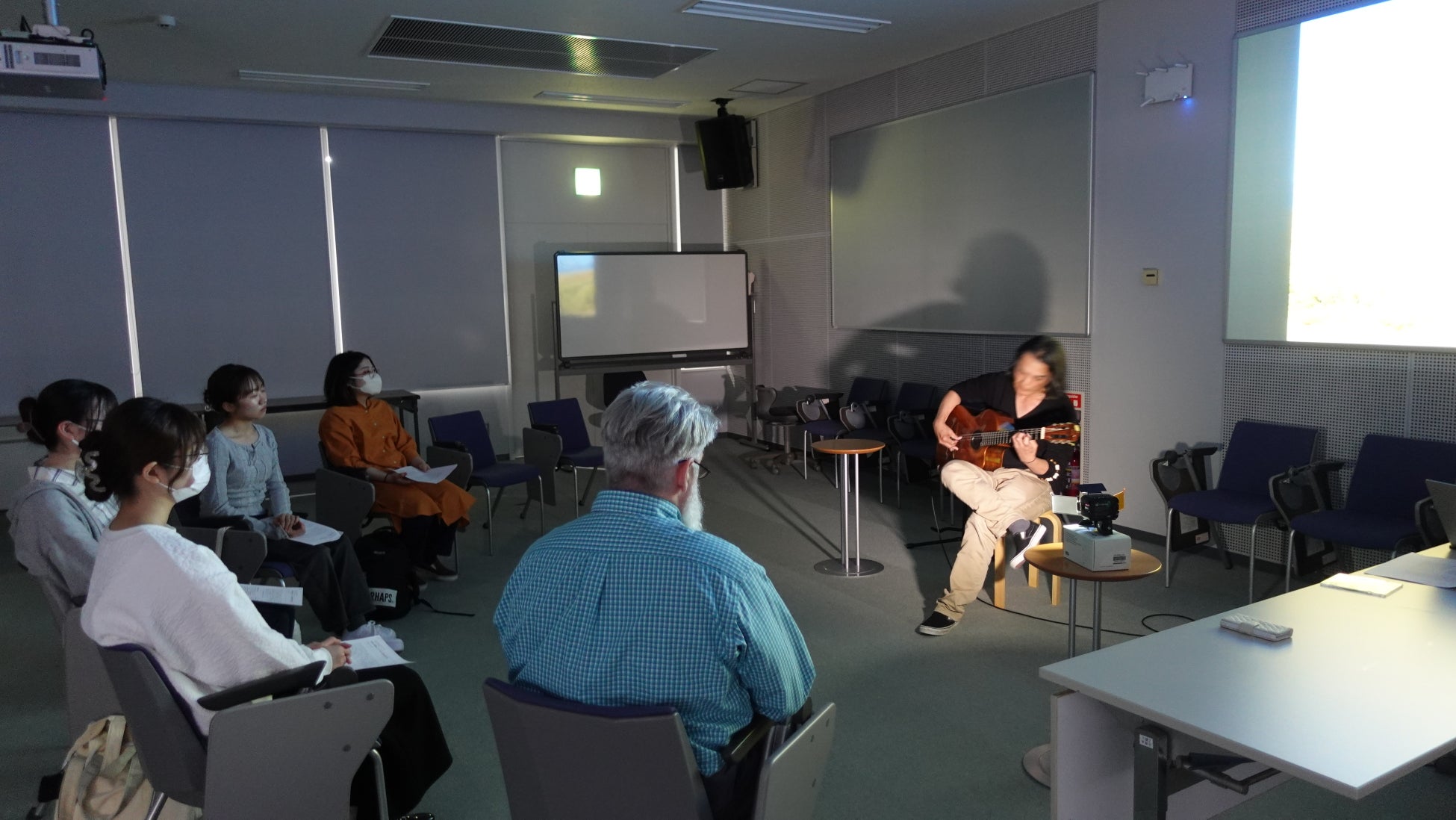 ネイティブアメリカンフルートの奏者かつ作曲家である森山氏のYouTubeチャンネルから選ばれた曲は、大地の鼓動のようなドラムの音、生命力溢れる赤ちゃんの泣き声、陽だまりのような暖かみのあるフルートの音色からなる心地よい音楽でした。その後、ナイロン弦ギターでオリジナル曲を演奏してくださり、レクチャーの受講者は癒しのひと時を過ごしました。
