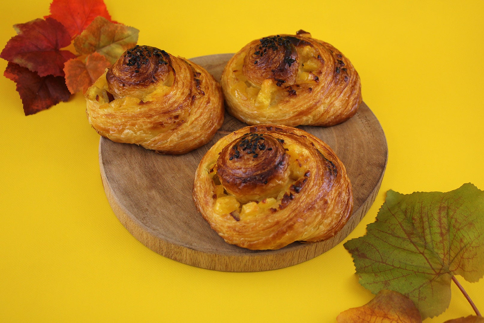 糖蜜漬けさつまいもダイスと北海道産牛乳のコクを生かしたクリームを巻き、さっくりと焼き上げました。バターの風味豊かなデニッシュ生地に、さつまいものごろっとした食感とやさしい甘さが絶妙にマッチします。