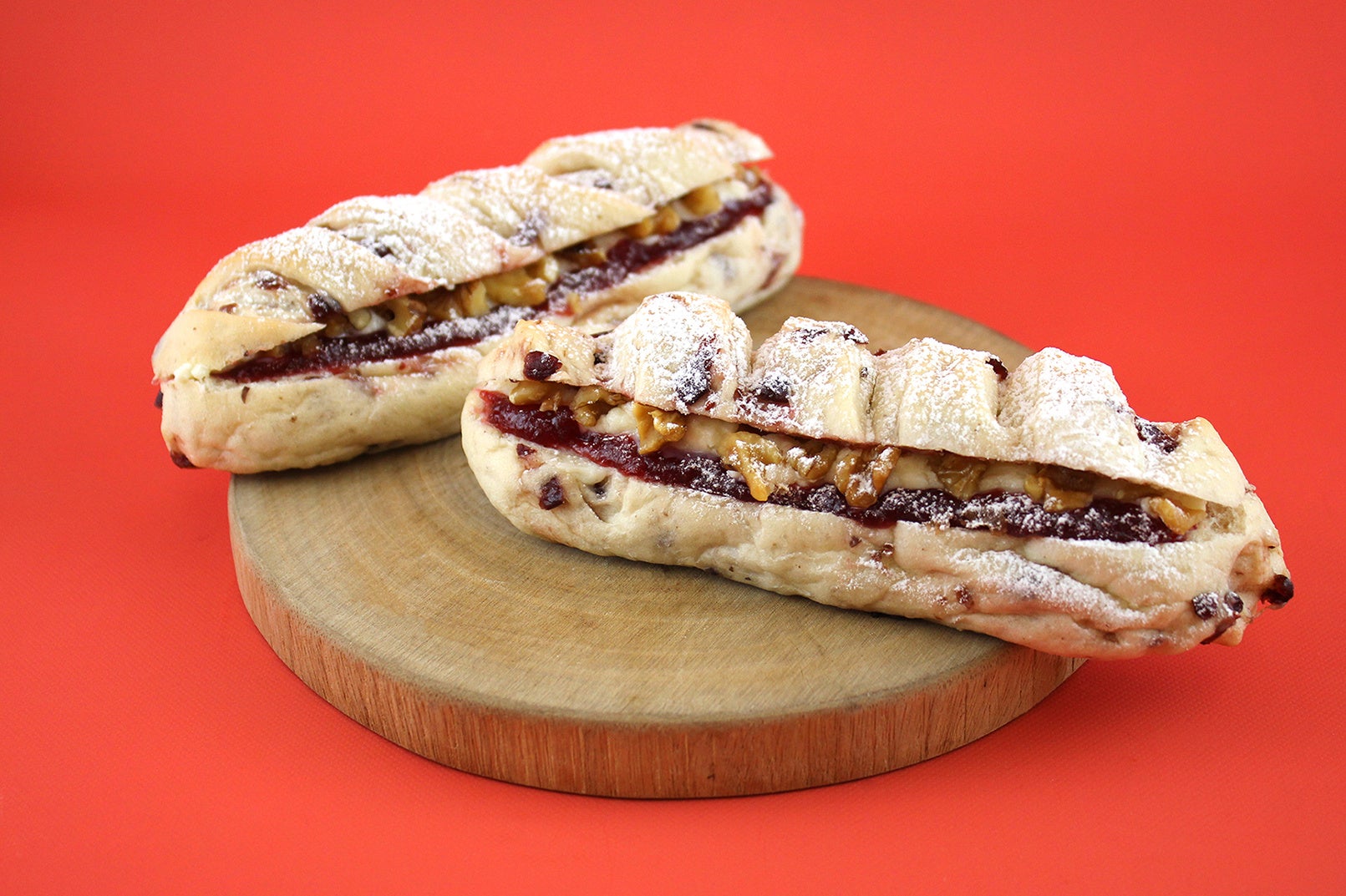 ドライクランベリーが入ったパンに、くるみとラズベリージャム、北海道産練乳のミルククリームをサンドしました。甘酸っぱいクランベリーの風味と、カリっとしたくるみの歯ごたえがクセになります。