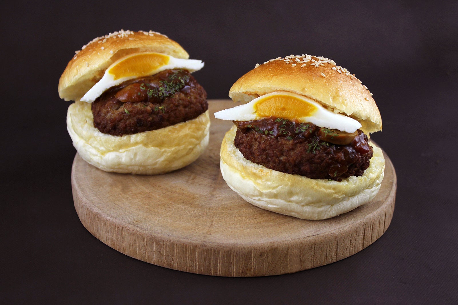 きのこ入りのデミグラスソースをかけたハンバーグと目玉焼き風オムレツをサンドしました。オムレツは半熟風で、ハンバーグをまろやかに引き立てます。
