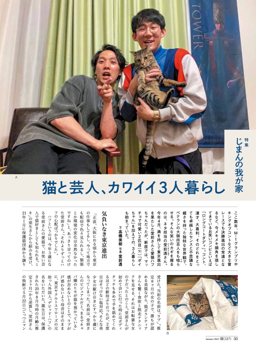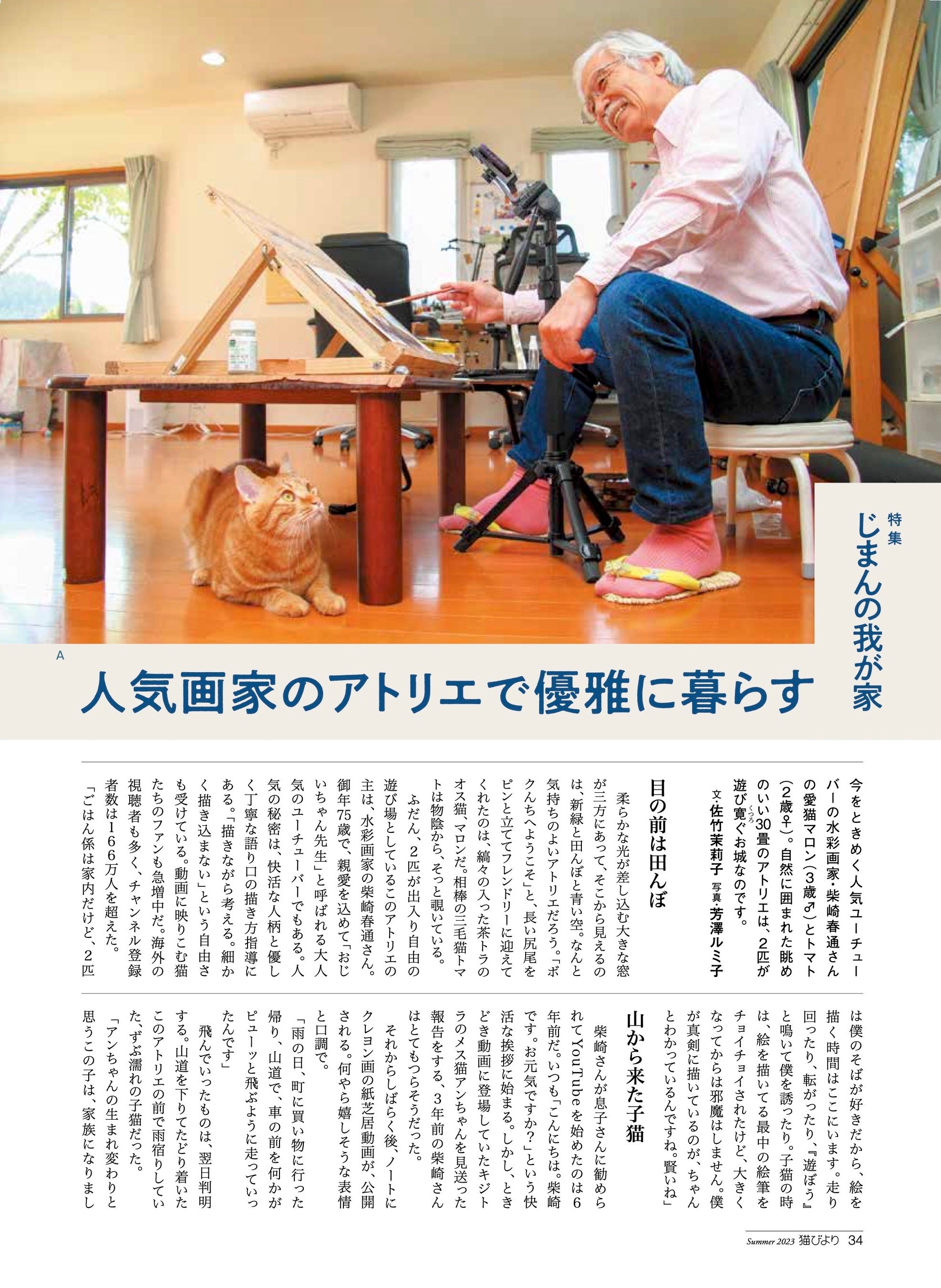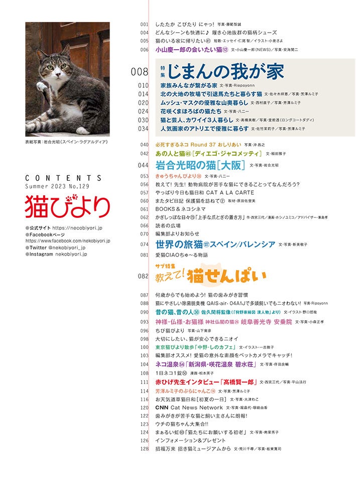 6月12日(月)発売の『猫びより』2023年夏号では、猫たち自慢の家や家族をたっぷりご紹介する特集「じまんの我が家」、猫飼い初心者さんのお悩みにベテラン猫飼いさんが答えてくれる「教えて! 猫せんぱい」、そのほかにも「小山慶一郎の会いたい猫」では、小山さんがタレント猫・ベーコンを、 岩合光昭さんは人情味あふれる街大阪を、新美敬子さんはスペインのバレンシアの猫を訪ねます。