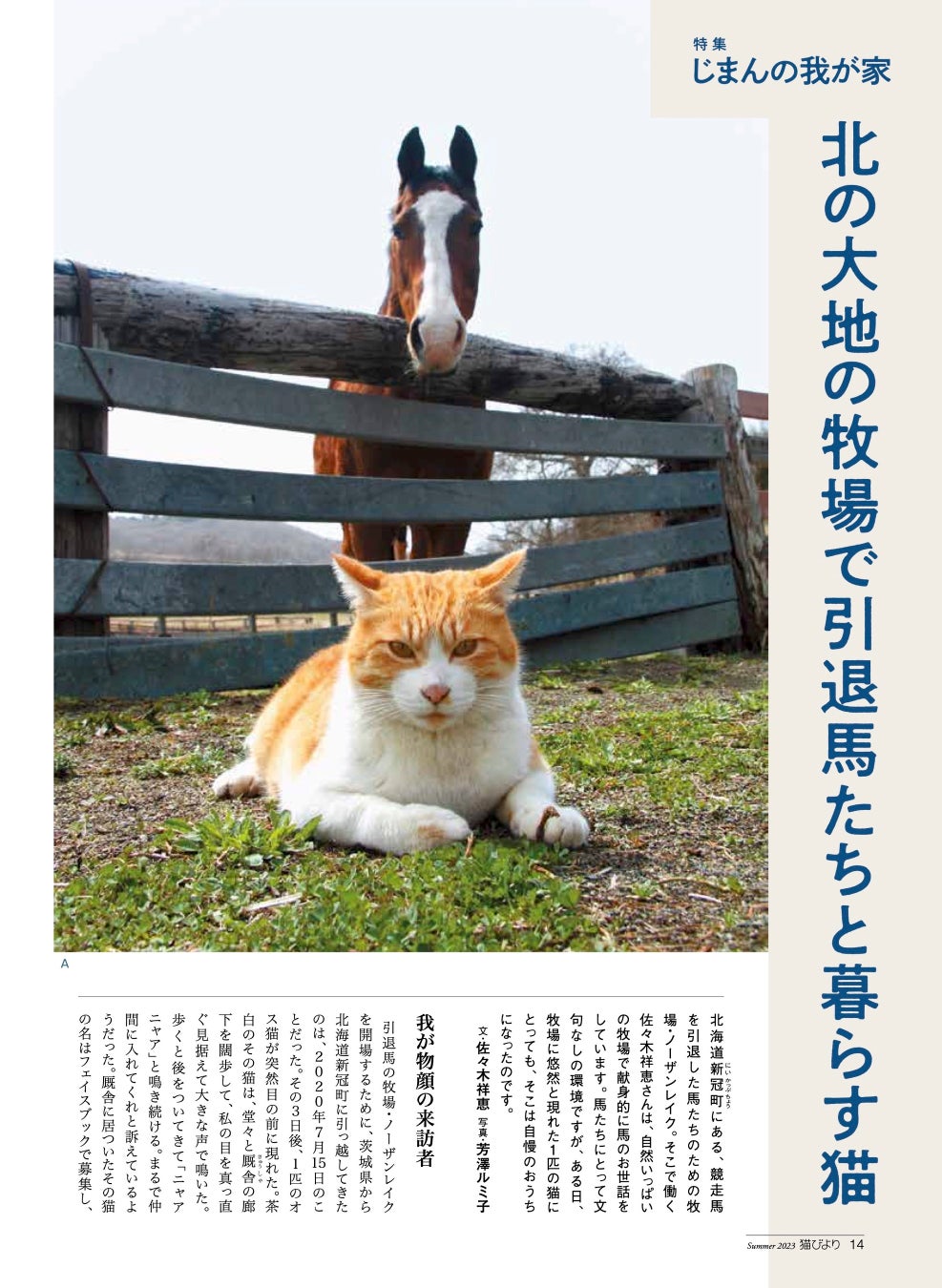 家族全員の住み心地を追求した家、四季折々の自然に囲まれた古民家、世界最大級の油彩画のある美術館、はたまた今をときめく人気芸人やYouTubeで人気の画家のお家、そして大自然で引退馬たちの余生に彩りを添える猫など、それぞれ異なる環境でさまざまな人や仲間に愛されて、猫たちは幸せに暮らしているのです。