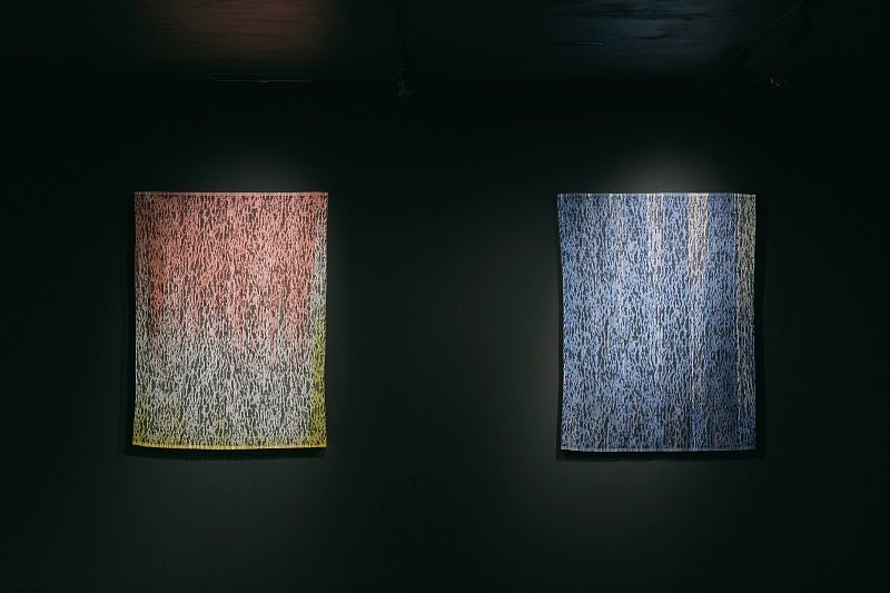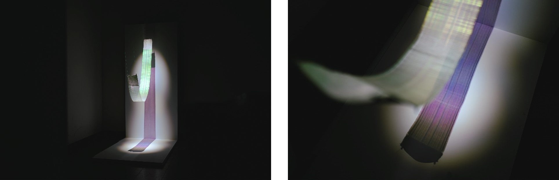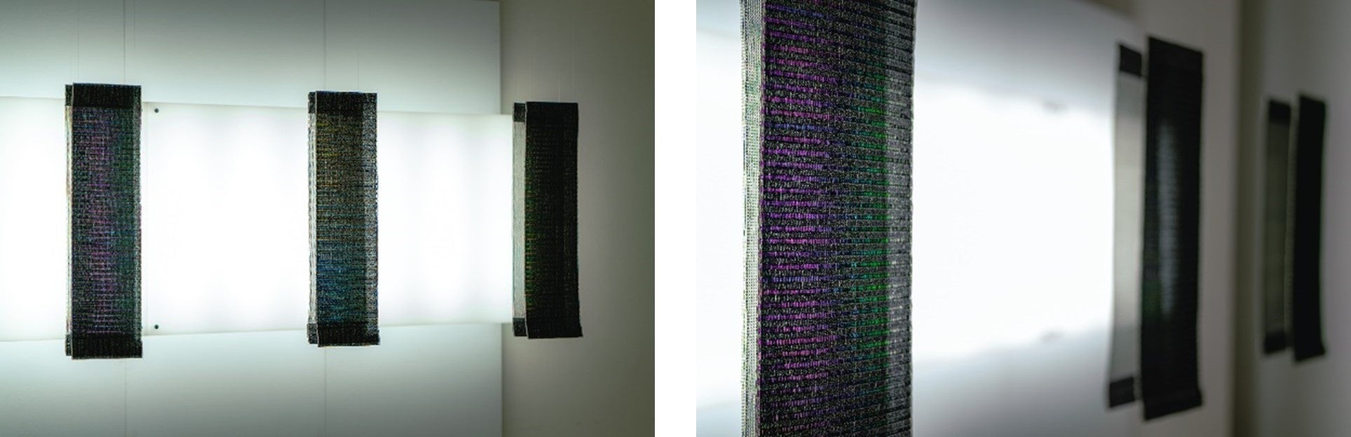 2枚の織物を重ね、光が透過すると発色する仕組みを持つインスタレーション。偏光板とOPPテープで構成された箔が織り込まれ、光が織物を重ねた状態で透過すると複屈折による光の干渉により偏光色が表れます。同じ素材ながらも偏光板の向きやテープの厚みを変えることで複数の色を表現し、また箔の順番のアレンジにより様々な色パターンを生成します。鑑賞位置によってもその見た目は動的に変化します。
