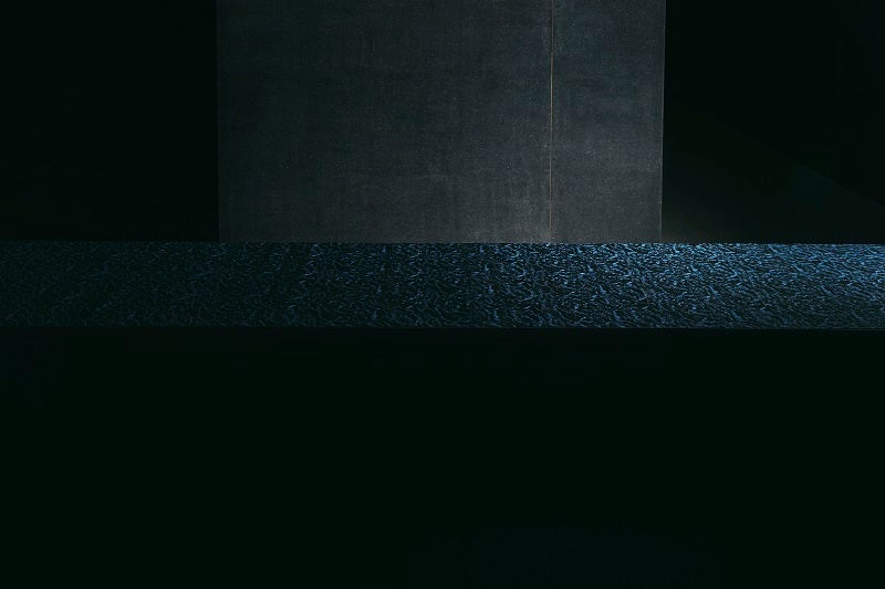 周辺環境の温度に応じて色が変化する織物です。特定の温度に達すると呈色するロイコ色素を含んだインクを和紙の両面に塗工し、裁断することで、箔紙として緯糸に織り込んでいます。25度以上になると黒から青色に呈色し、温度が下がると黒色へと戻っていきます。この可逆的かつリアルタイムの変化を通して、温度の変化を視覚的にも訴えることで人々の意識を開きます。