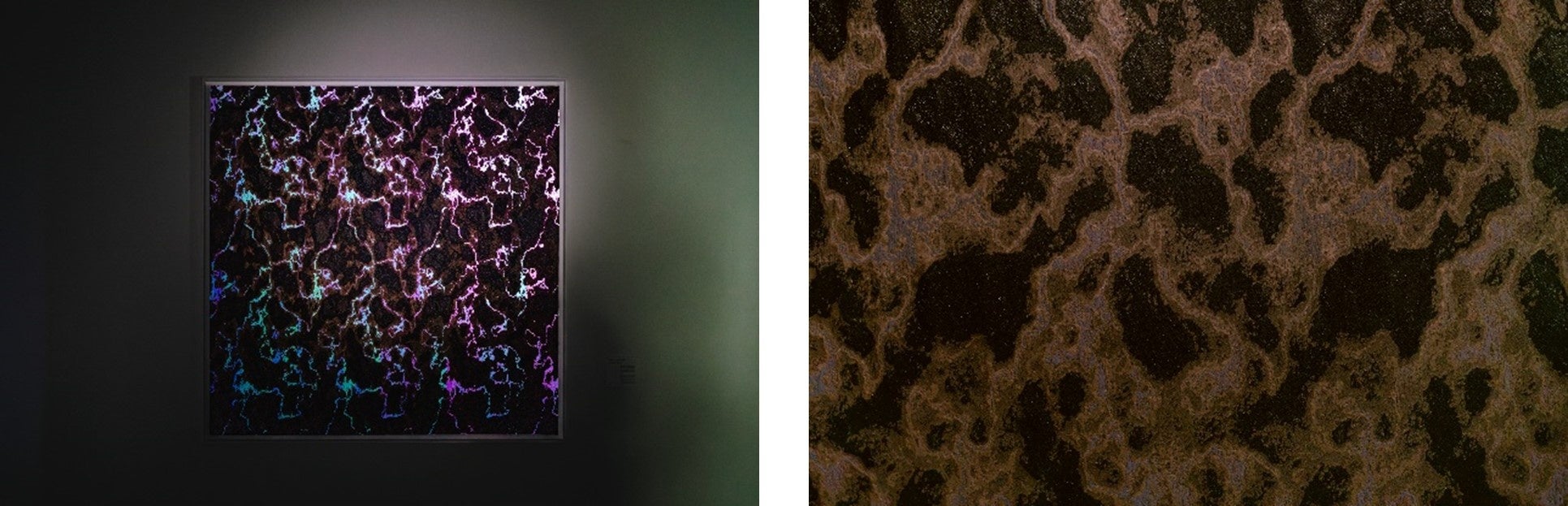 クロマトグラフィーというロシアの植物学者ミハイル・ツヴェットが発明した物質を分離する技法を応用した織物です。本来、染色とは糸に染料を吸収させ、定着させることを指しますが、この作品では、それぞれの染料の電荷・質量・疎水性の差により、異なる時間で糸の中を染料が移動します。湿度や水分量を適正に保つことで、この分離と移動が起こり、染料が糸へと浸透した後も動的に色が変化し続けます。