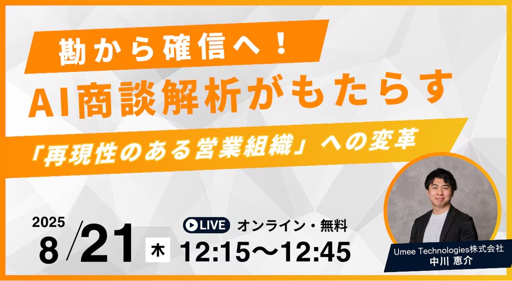 組織に進化をもたらす話術AI「Front Agent」を開発・提供するUmee Technologies株式会社(本社:東京都調布市、代表取締役:新納 弘崇、以下「ユミー」)は、8月21日(木)12:15 - 12:45に無料オンラインセミナー"勘から確信へ。AI商談解析がもたらす「再現性のある営業組織」への変革"を開催いたします。