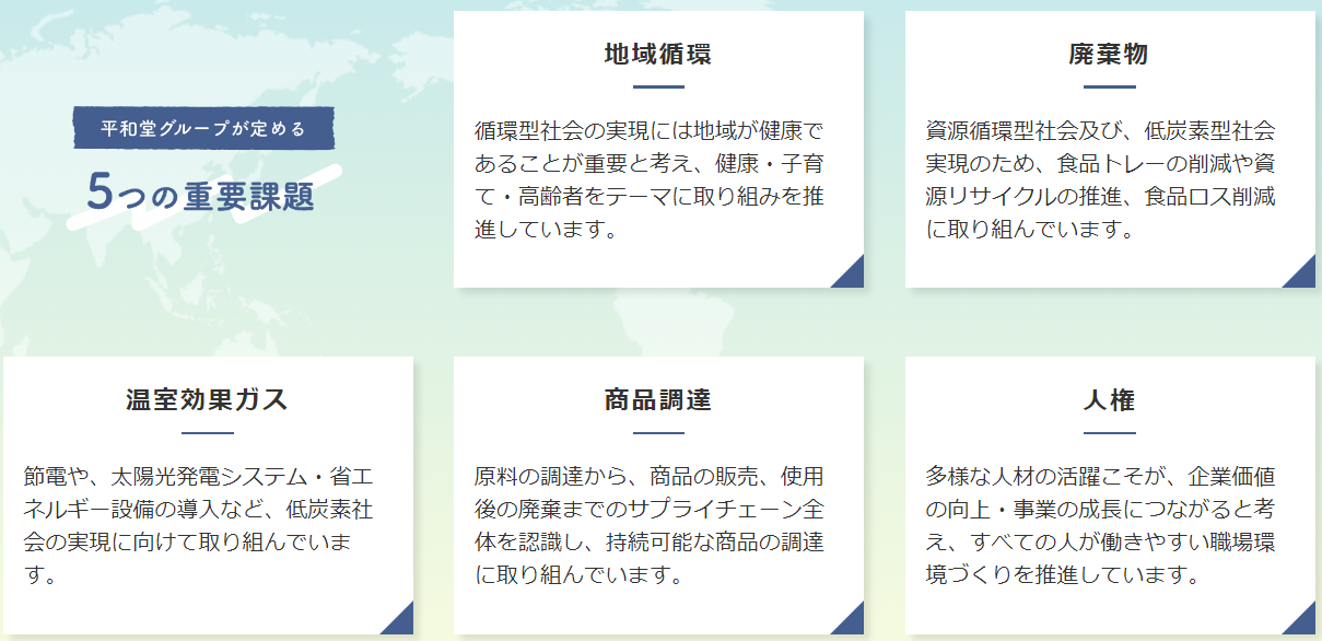 創業 65 周年を迎えた平和堂を核とするグループでは「100 年企業」を実現するため、「地域になくてはならない存在」となるべく、「地域密着ライフスタイル総合(創造)企業」を目指しています。2021 年には、事業を通じた「地域社会の課題」と「地球規模の課題」の解決とグループ成⾧の両立を目指した「サステナビリティ・ビジョン」を策定し、これまでの取り組みをサステナビリティの観点で改めて整理するとともに、基本方針を定め、5つの重要課題を特定し、施策、目標値を設定しました。