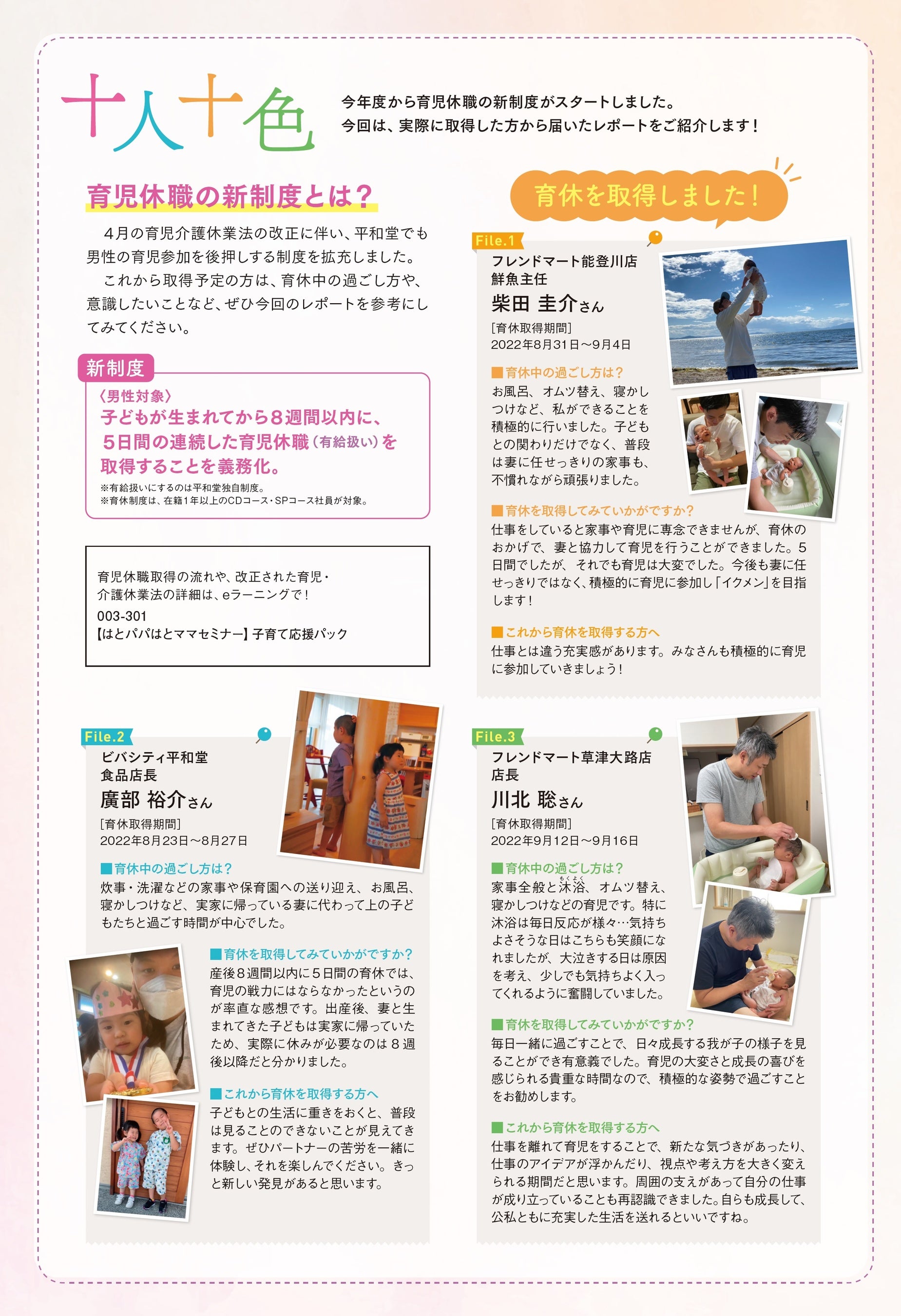 ■平和堂グループ報「はと」では、育休制度の説明や男性取得者の育休レポートを掲載し、情報発信