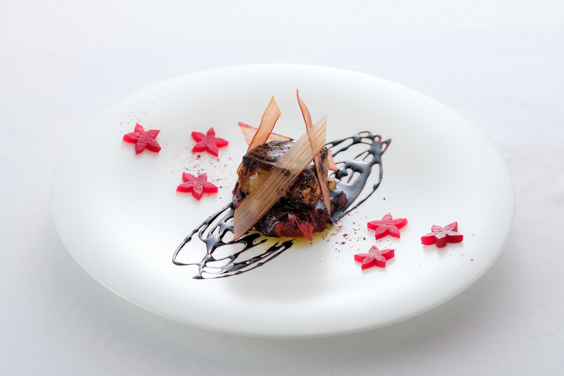 リーフチュイルの上には、フォアグラ、玉葱、白ワインに稚鮎のコンフィを合わせたリエットを載せています。新牛蒡の香りと稚鮎の苦味を、"スイカの概念を変えた"と名高い希スイカを使ったガスパチョとともにお愉しみください。