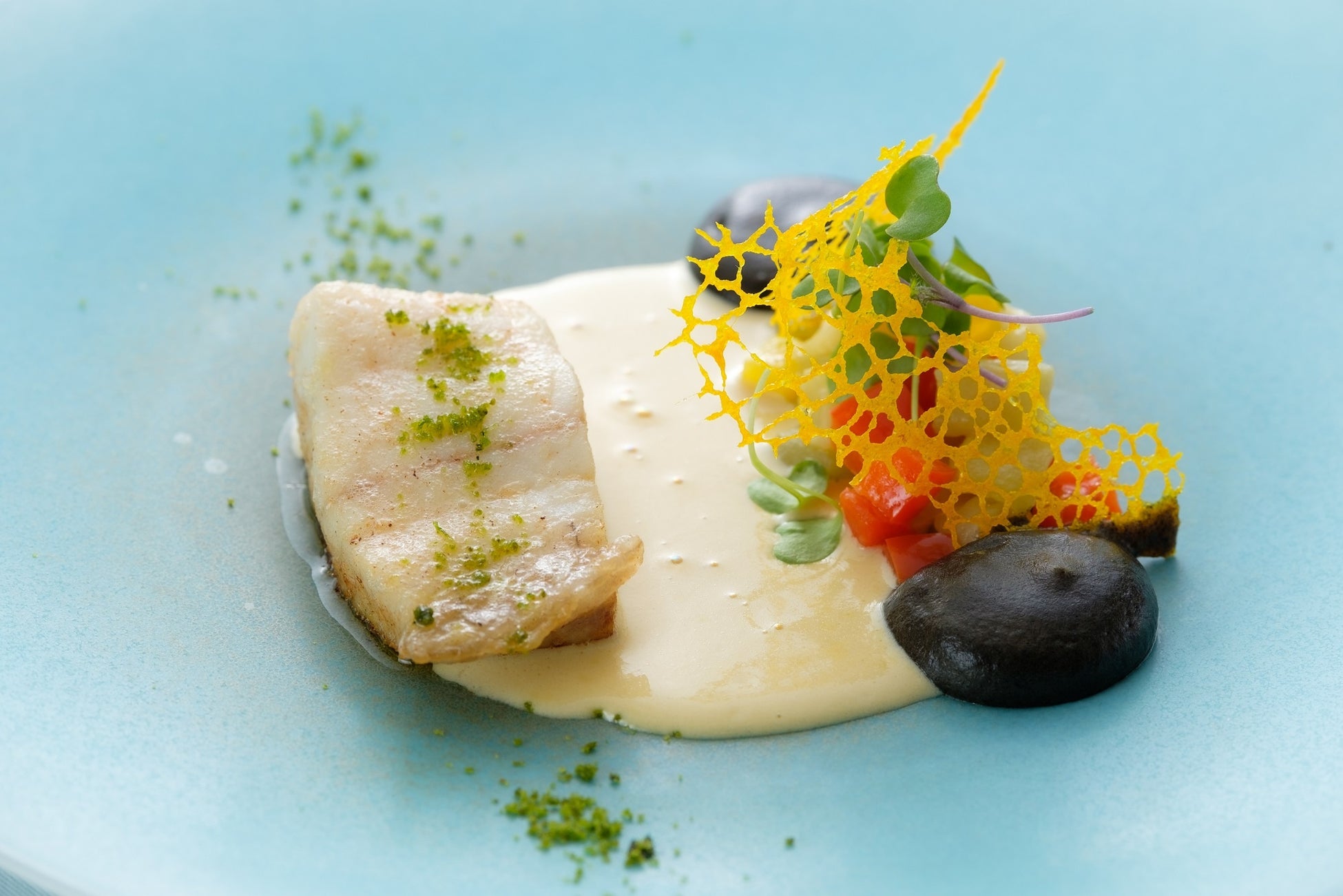今回は石鯛を真昆布で昆布締めにしてムニエルにしました。サフラン香る焼き茄子のエスプーマソースと、佐土原茄子と温泉パプリカの付け合わせとともにお召し上がりください。