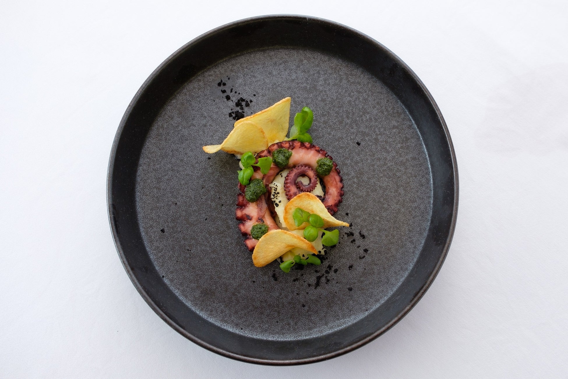 柔らかく煮た大分県産の蛸と合わせるのは、自家製バターを加えた新ジャガイモのピュレと、バジル、松の実、オリーブオイルで作ったジェノヴェーゼソース。