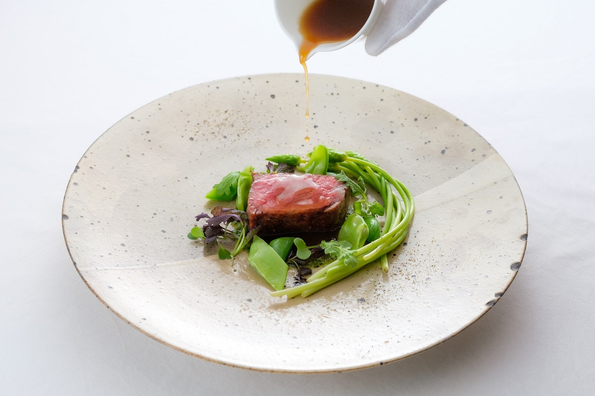 召し上がる直前にあか牛のスジ肉から作ったソースをかけて仕上げます。