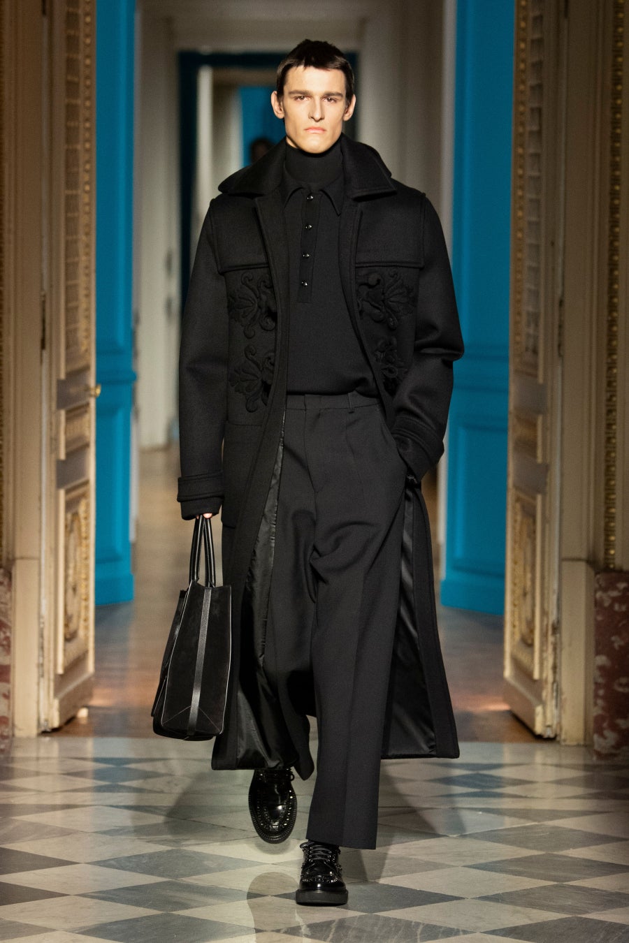 このメッセージは、イデオロギーや哲学を反映し、あり方をファッション化する衣服によって伝えられます。新たなアプローチや考察が組み込まれたウェア。ソフトになったテーラリングが柔らかい男性像を生み出します。テーラリングとオートクチュールという二つの領域を結び、エンブロイダリーや装飾がウェアの表面のみならず、そのアイデンティティをも変化させます。職人たちの技を称えることは、人間らしさの表れでもあります。神話に登場するモチーフがテーラリングの中にインターシャで表現され、美徳と生、普遍的な道徳性の物語として、理想主義と時代を超えた人間の価値を表します。ヴァレンティノアルトリリエーヴォ(ハイレリーフ、浮き彫り)と名付けられた彫刻のような刺繍のテクニックがジャケットのショルダーを飾り、男性らしい力強さの典型的なあり方を破壊します。