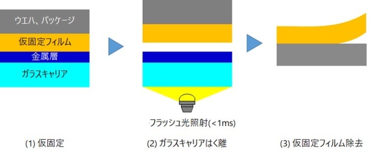 レゾナックは、このPulseForgeの光照射システムを用いた光剥離プロセスに適した仮固定フィルムを開発しました(*3)。本フィルムは、膜厚均一性に優れているほか、厚さ20 μmの超薄型ウエハにも対応しています。また、本フィルムは、ウエハやパッケージから容易に除去できるため、洗浄プロセスを最小限に抑えることができます。
