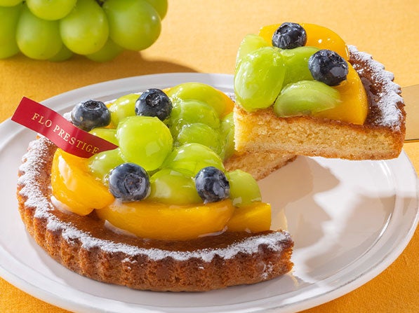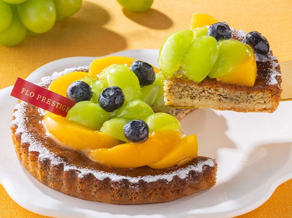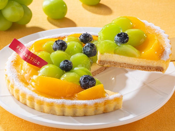 瑞々しく色鮮やかなシャインマスカットと、とろりとした優しい甘さの黄桃シロップ漬けをトッピングした「シャインマスカットと黄桃のタルト」が登場!華やかに盛り付けた直径約14~15cmのホールタルトを、FLOの日限定価格・税込1,393円で販売いたします。