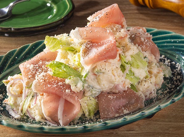 FLO人気のポテトサラダに程よい塩味と旨味が凝縮した生ハムをトッピングし、粉チーズとブラックペッパーで仕上げました。リッチで華やかなポテトサラダです。