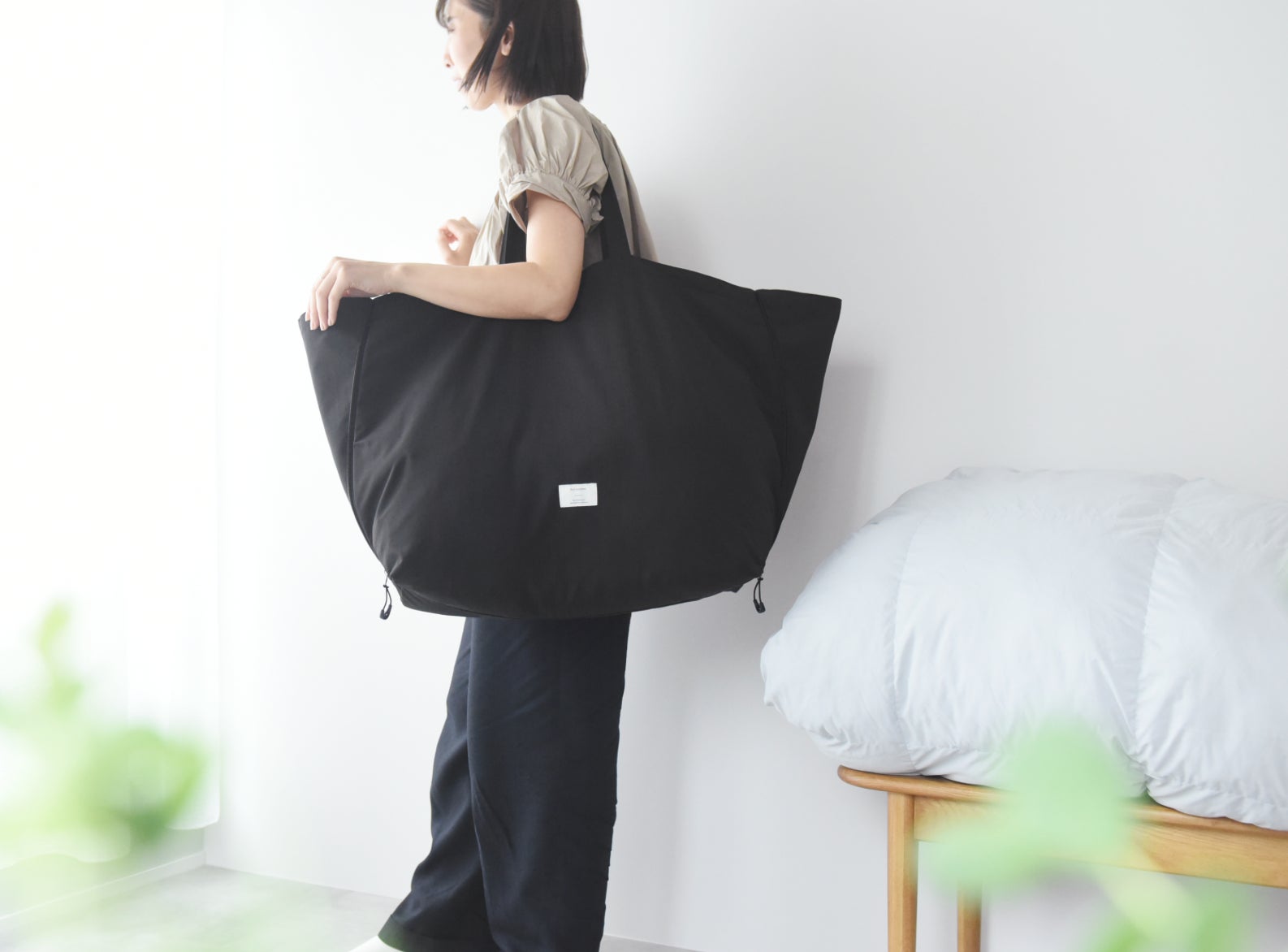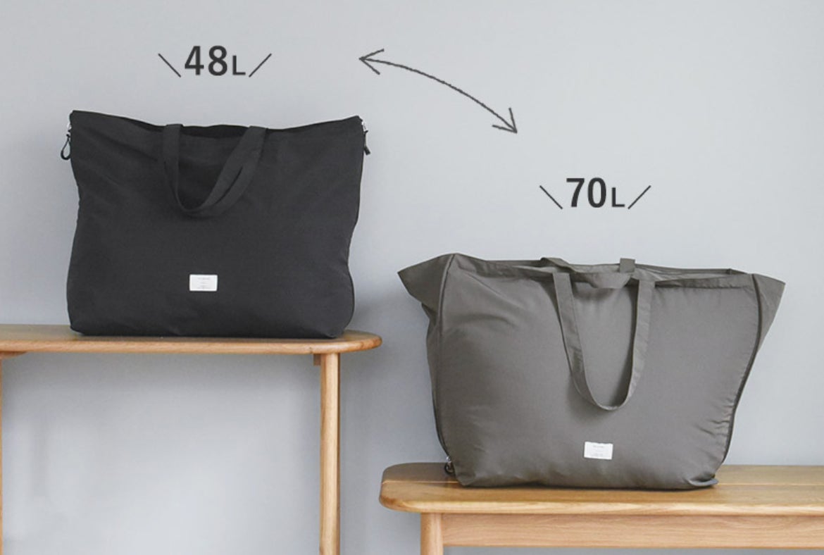 48Lから70Lまで、サイズを拡張して使えるトートバッグが、ボンモマンから新登場。大きくした状態なら羽毛布団もすっぽり。コインランドリーやクリーニング、旅行のサブバッグまで、多彩なシーンで重宝します。