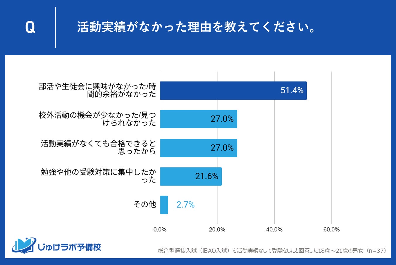 じゅけラボ予備校(所在地:大阪市北区、代表取締役:後藤智則)は、この度、総合型選抜入試で受験した18歳から21歳の男女で「活動実績がなかった」と回答した37名を対象に、課外活動実績の有無が受験結果に与える影響についての調査を実施しました。