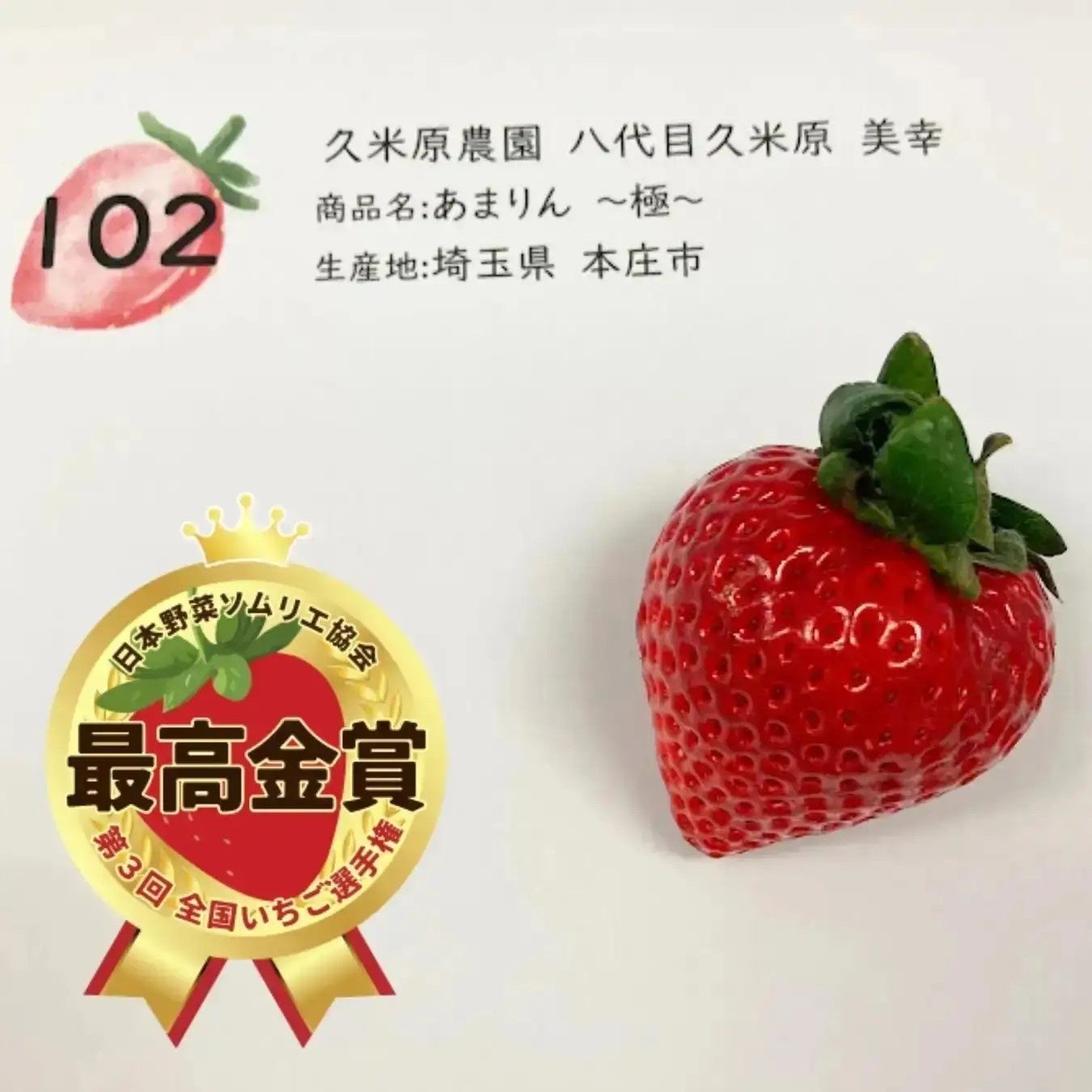 「第1回全国いちご選手権」最高金賞は、ヒロファーム(埼玉県春日部市)の『あまりん』。「第2回全国いちご選手権」最高金賞は、市川いちご園(埼玉県秩父市)の『あまりん』。「第3回全国いちご選手権」では全375品のエントリーから、久米原農園 八代目久米原美幸(埼玉県本庄市)の『あまりん~極~』が最高金賞に輝き、埼玉県産のいちご『あまりん』が3年連続で最高金賞を受賞しました。