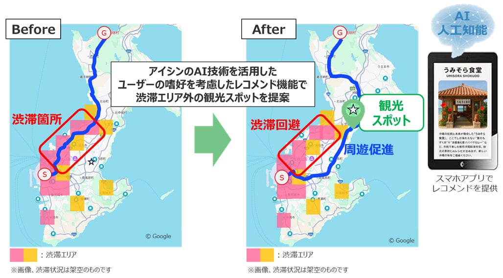 当社は、交通情報から算出した渋滞エリアの迂回や、ユーザーの嗜好に合った寄り道スポットを提案するスマホアプリを開発しました。ユーザーの嗜好の学習し、最適な観光スポットを提案するレコメンド機能に当社のAI技術を活用しています。