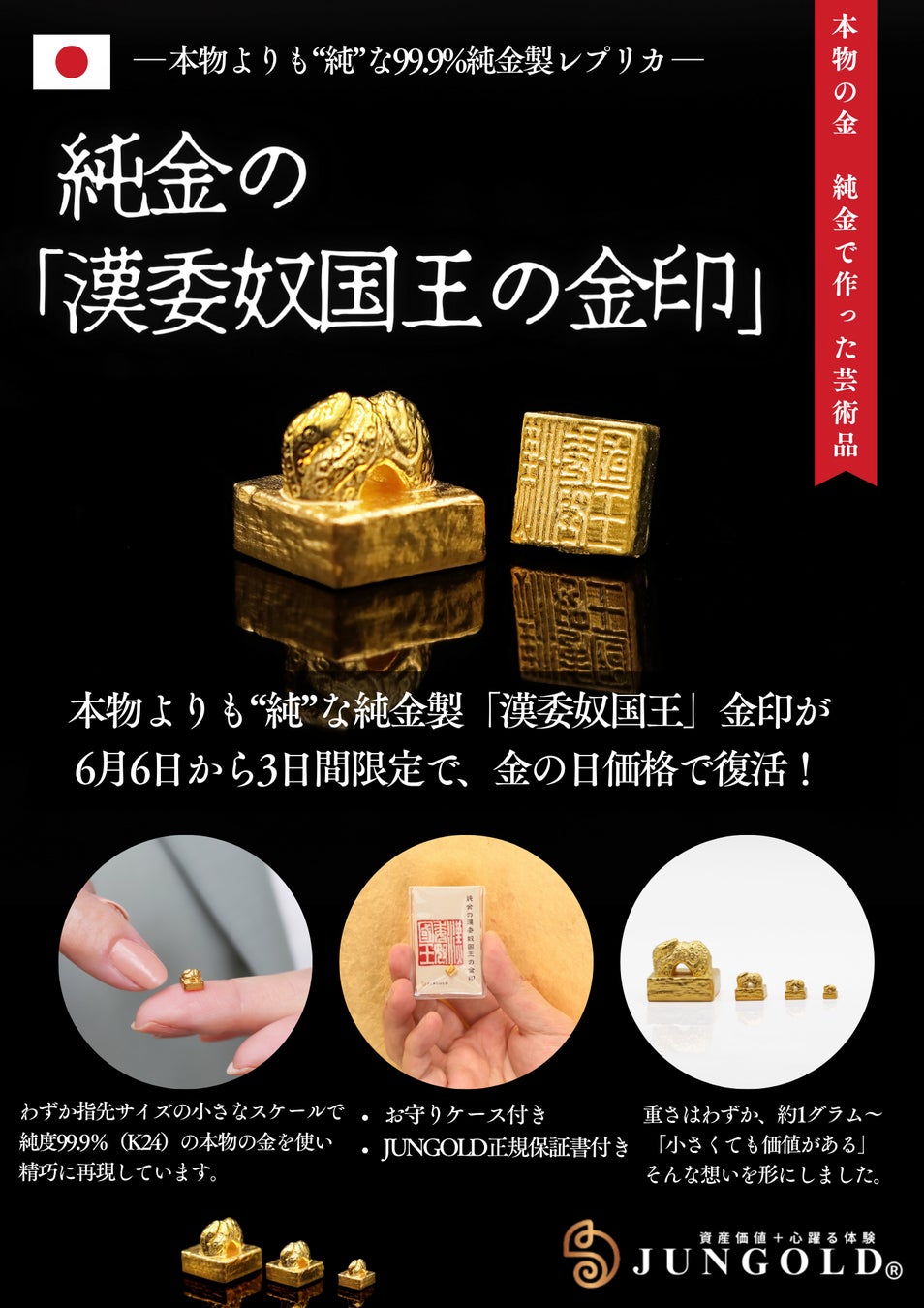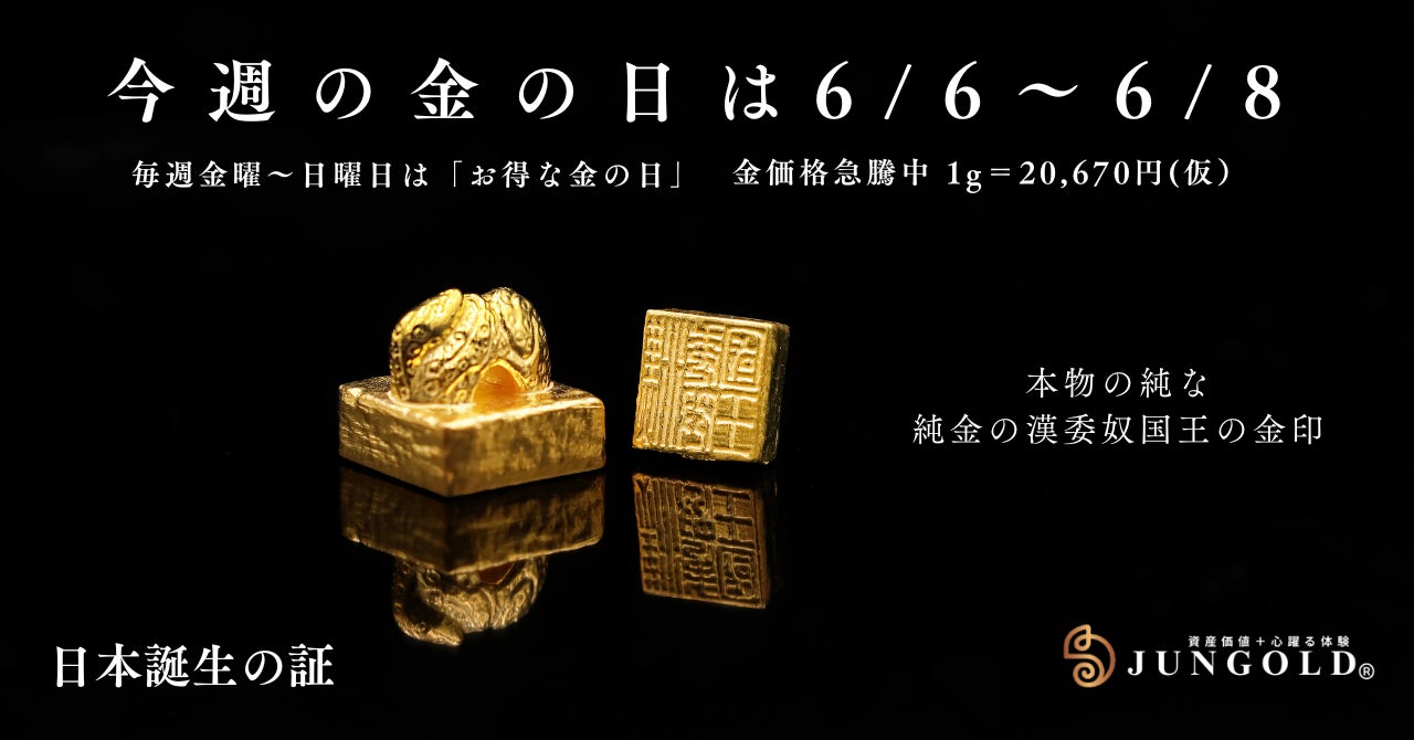 【純金の金印】6月6日~8日の3日間限定、お得な「金の日価格」で日本誕生の証「漢委奴国王の金印」を予約販売します。本物より「純」な純金の金印が、1gのミニチュアサイズ「約2万円」で予約販売を開始。