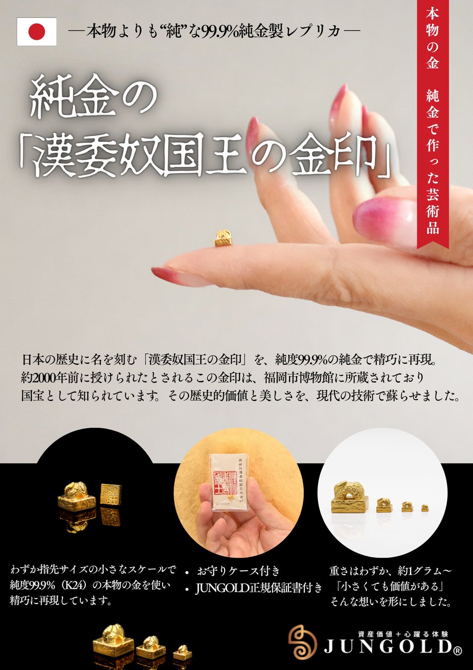 「本物以上に“純”な金印」として、歴史の重みと資産価値を兼ね備えた復刻モデルを展開しています。