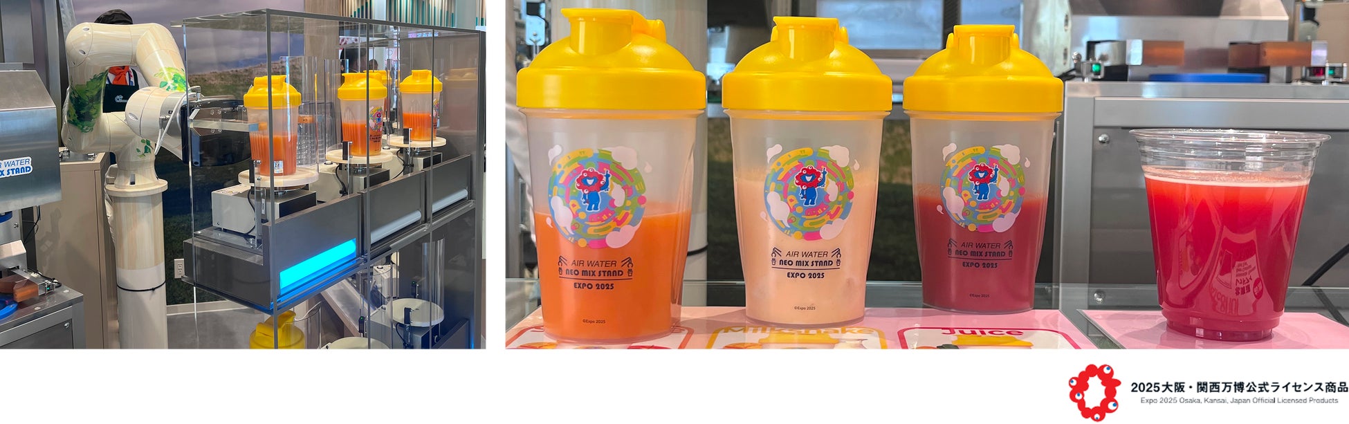 当社発祥の地で農業・食品事業を展開する北海道の食材を用いたスムージー等のドリンクをロボットが作り提供します。また、ミャクミャクデザインのオリジナルドリンクボトルは来場記念としてお持ち帰りいただけます。