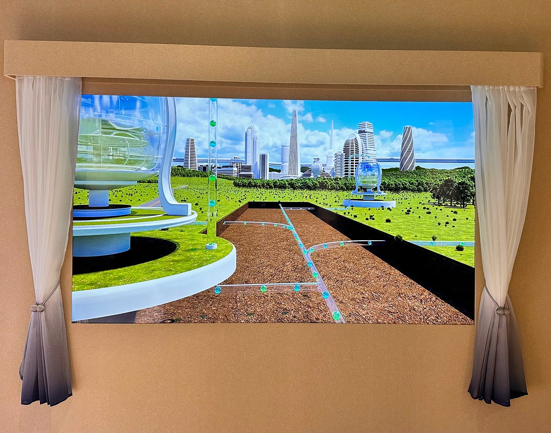「2050年のミライのホーム」を表現。リビング、キッチン、ウィンドウの3つのゾーンで構成され、ミライの運動・くつろぎ、食事などのミライのくらしを体験することができます。
