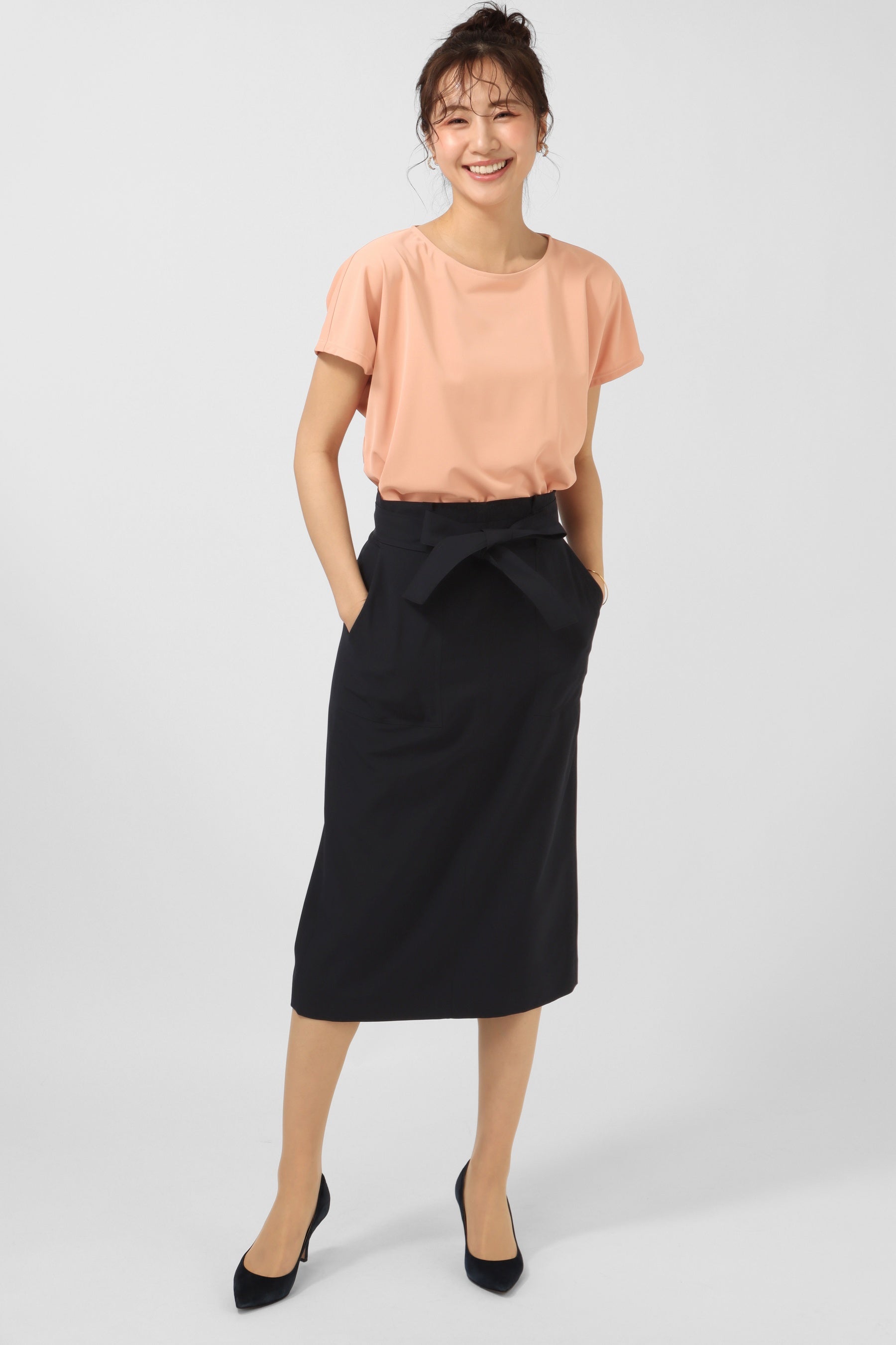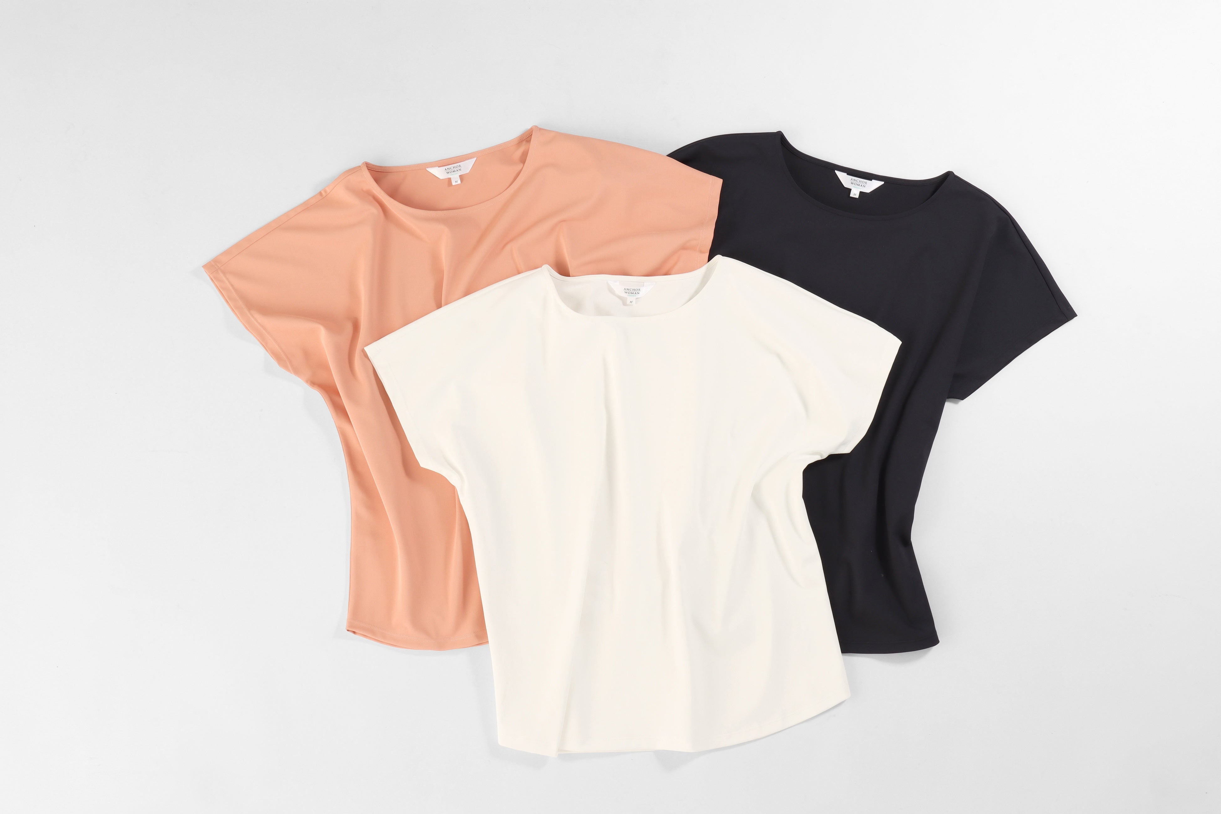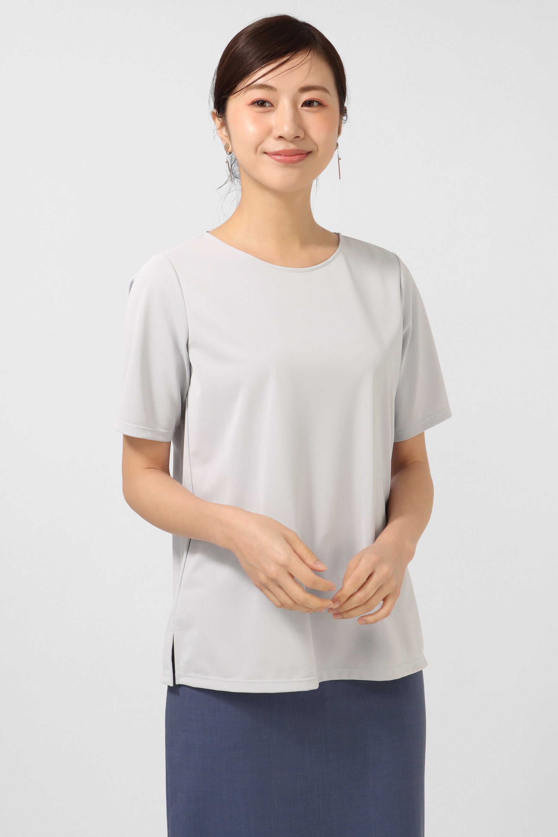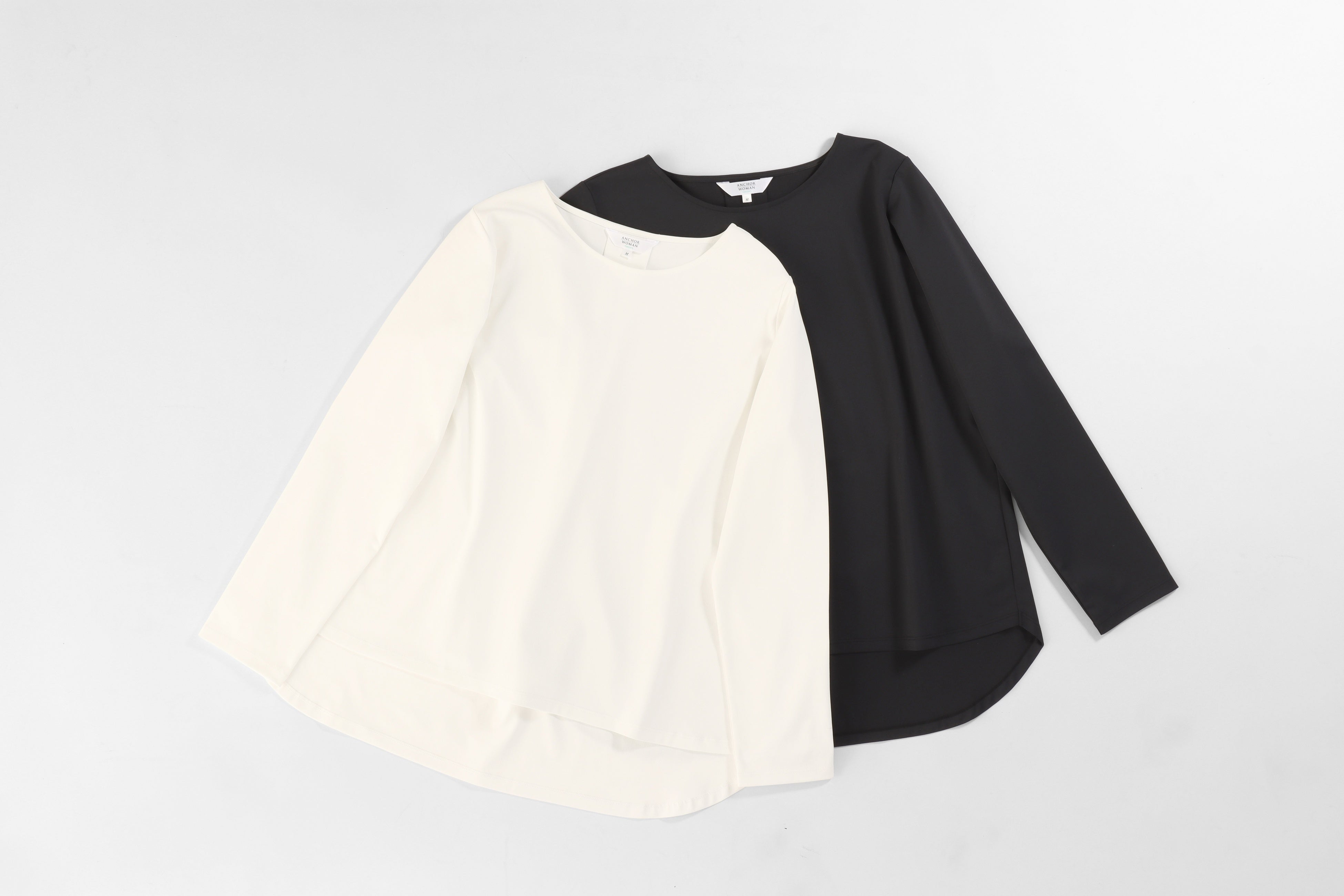 デザインは、長袖・5分袖・半袖の3種類を用意。Tシャツ以上ブラウス未満の絶妙なデザインにするため、程よくデコルテが見えるネックラインにこだわり、袖口と裾はダブルステッチでTシャツのディテールを採用しています。長袖は、裾部分をラウンドカットにし、前後差をつけることによってボトムインでもアウトでもバランスがとれるよう工夫しています。5分袖は二の腕をしっかりカバーする長さに設定。ジャケットを羽織っても邪魔にならないよう袖幅も調整しました。半袖は、ラグランスリーブにすることで柔らかい印象になるようにしています。