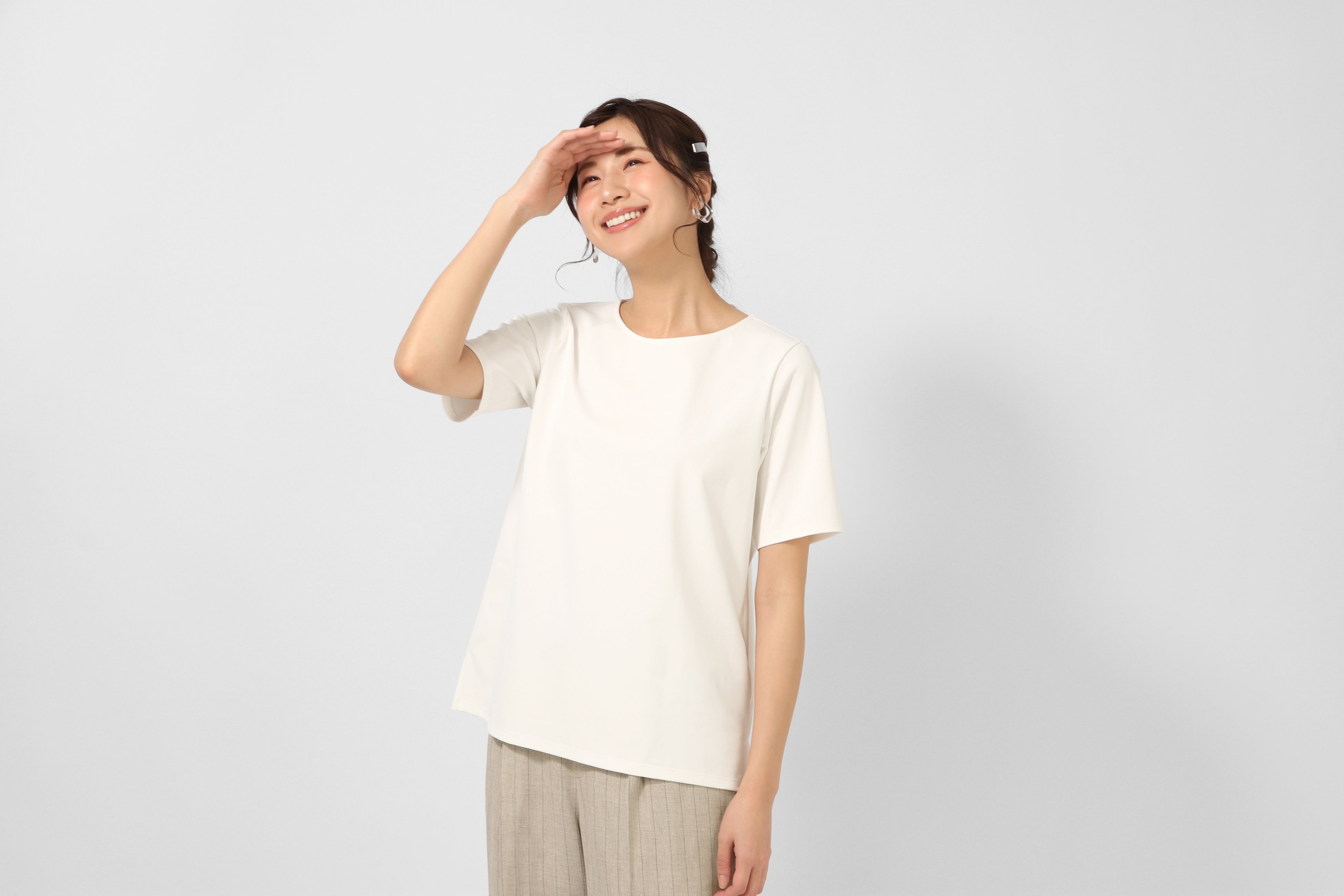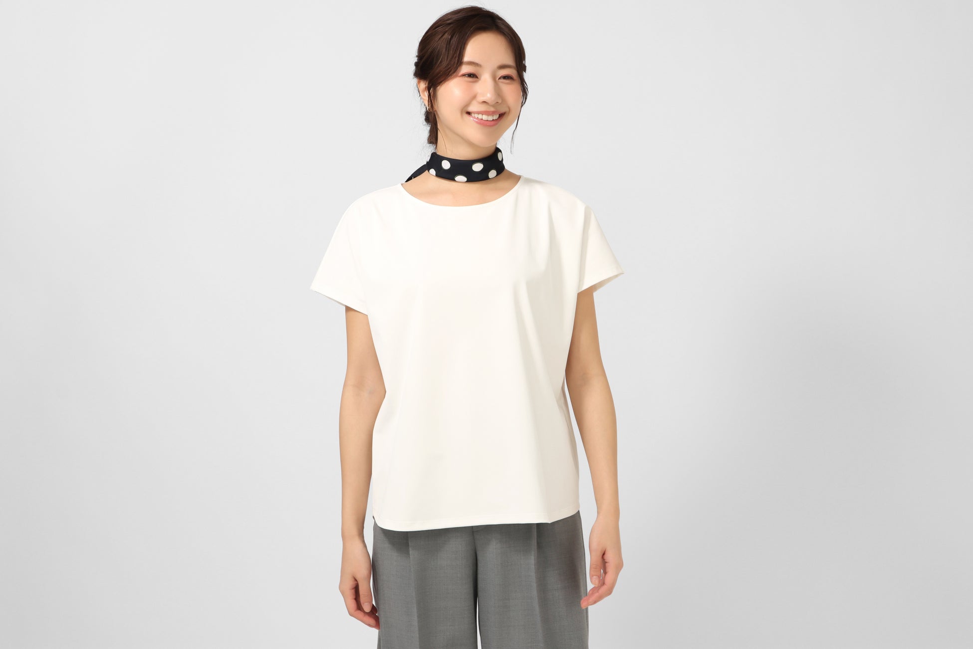 Tシャツほどラフすぎず、でもブラウスほどきれい目すぎない、ビジネスで使いやすい白Tシャツがお仕事着であったら便利ではないかと思い企画しました。生地の選定から細かいデザインまでこだわったトップスです。スーツを着用する方もしない方も、普段着としても使えるトップスを求めている方も、是非、商品をご試着いただき透けない等の高機能性を体感していただきたいです。