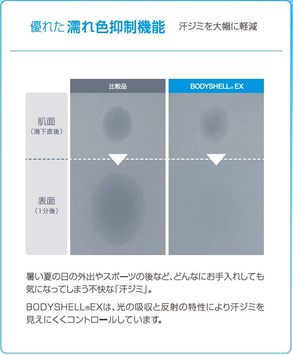 生地には、高機能素材「BODYSHELL®EX」(東レ株式会社)を使用。太陽光エネルギーを遮断し光の透過を防ぐことで、高い次元で「透け防止」を実現しました。加えて、「UVカット」や「遮熱」、「汗ジミ抑制」機能も兼ね備えており、1枚で着る機会が増える春夏にも安心して着用できます。