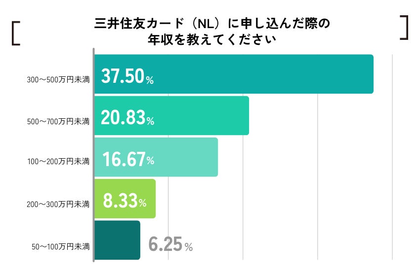 三井住友カード(NL)に申し込んだ際の年収は「300~500万円未満」が最も多く、全体の37%を占める。一方で年収が「1~100万円未満」で申し込んだ方も約1割存在する。