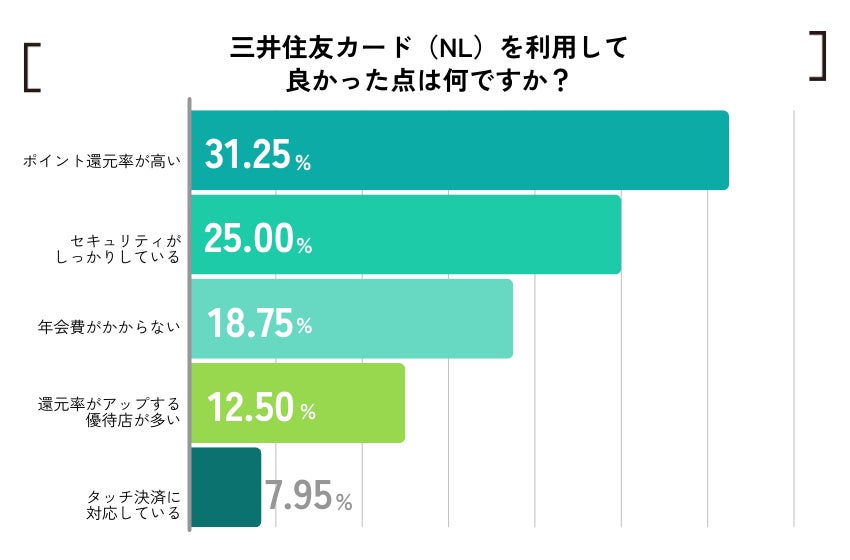 三井住友カード(NL)を利用して良かった点として「ポイント還元率が高い」と答えた方が全体の31%。次いで「セキュリティがしっかりしている」と答えた方が25%を占める。