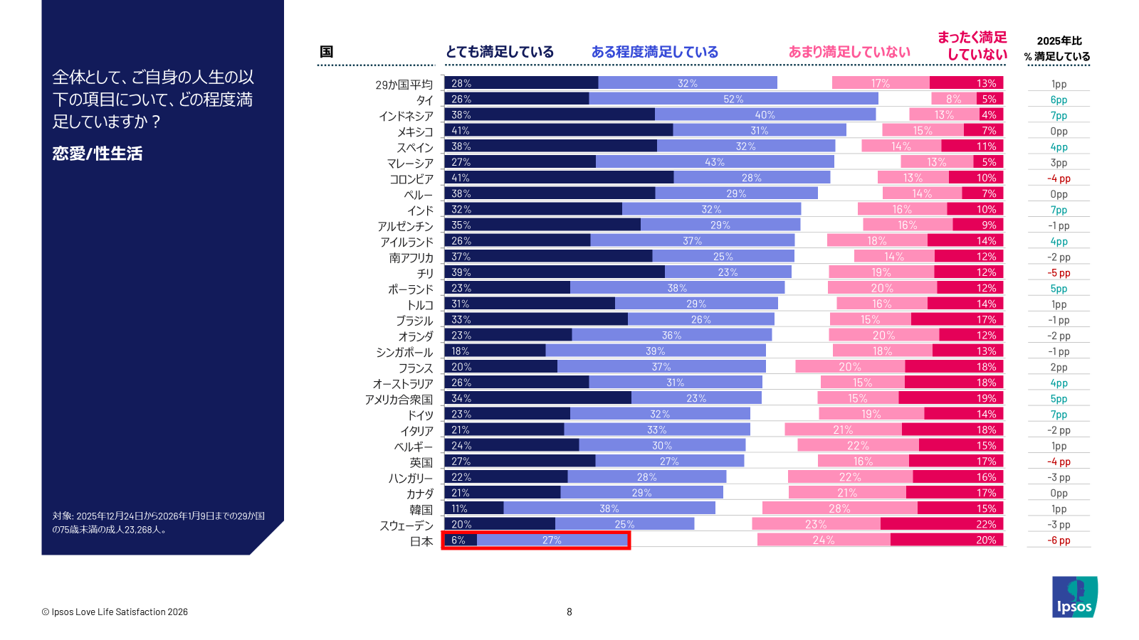 また、日本で「恋愛や性生活」に満足していると回答したのは33%であり、2025年から6ポイント減少、29か国中最も低い満足度となっています。(グラフ2)