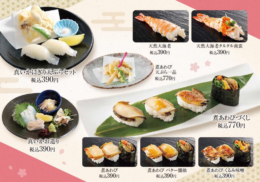 ご愛顧いただいているお客様への感謝の気持ちを込めて、蟹や真いか、天然大海老、国産牛などのにぎり寿司を税込390円のサンキュー価格にて販売します。この機会にぜひご利用ください。