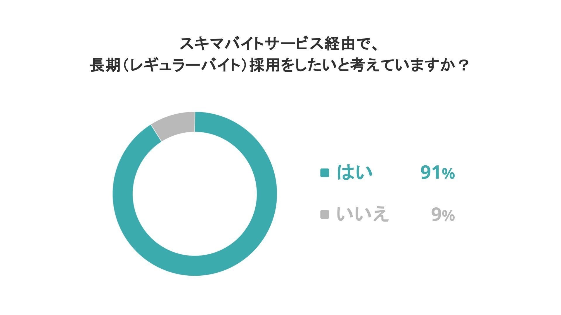 91%の企業担当者が、「スキマバイトサービス経由で長期(レギュラーバイト)採用をしたい」と回答した。このことから、多くのスキマバイトサービス利用企業に、スキマバイトサービスが「長期採用にも活用できる」と認識されていることが明らかになった。