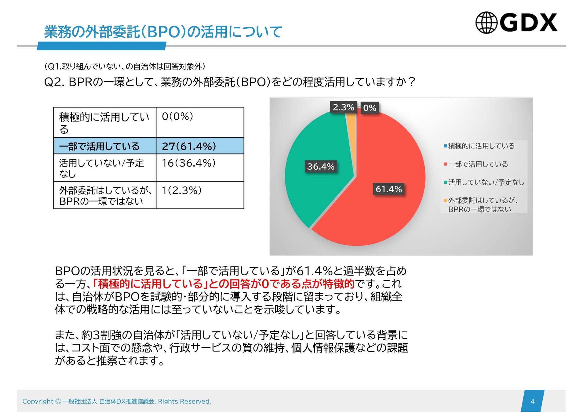 一般社団法人自治体DX推進協議会は、このたび「自治体BPR・BPO実態調査レポート」を完成いたしました。本レポートは、全国の自治体を対象に実施した業務プロセス改革(BPR)とビジネスプロセスアウトソーシング(BPO)に関する実態調査の結果をまとめたものです。