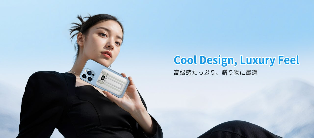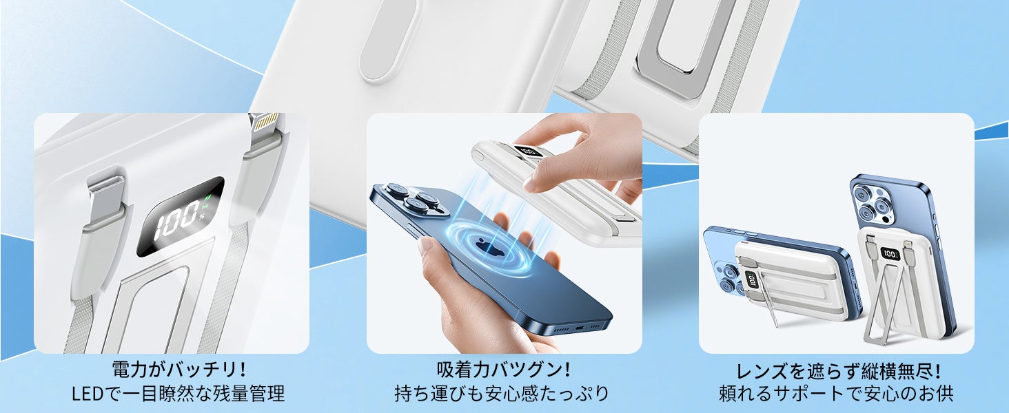Type-C(最大出力22.5W)とLightning(最大出力20W)の2本の充電ケーブルが内蔵され、ワイヤレス充電を含めて最大3台のデバイスを同時に充電可能。出先でケーブルを忘れる心配がなく、友人や家族と充電をシェアする際も、このバッテリー1つで事足ります。スマートで手軽な使い心地が、日常をより快適にします。
