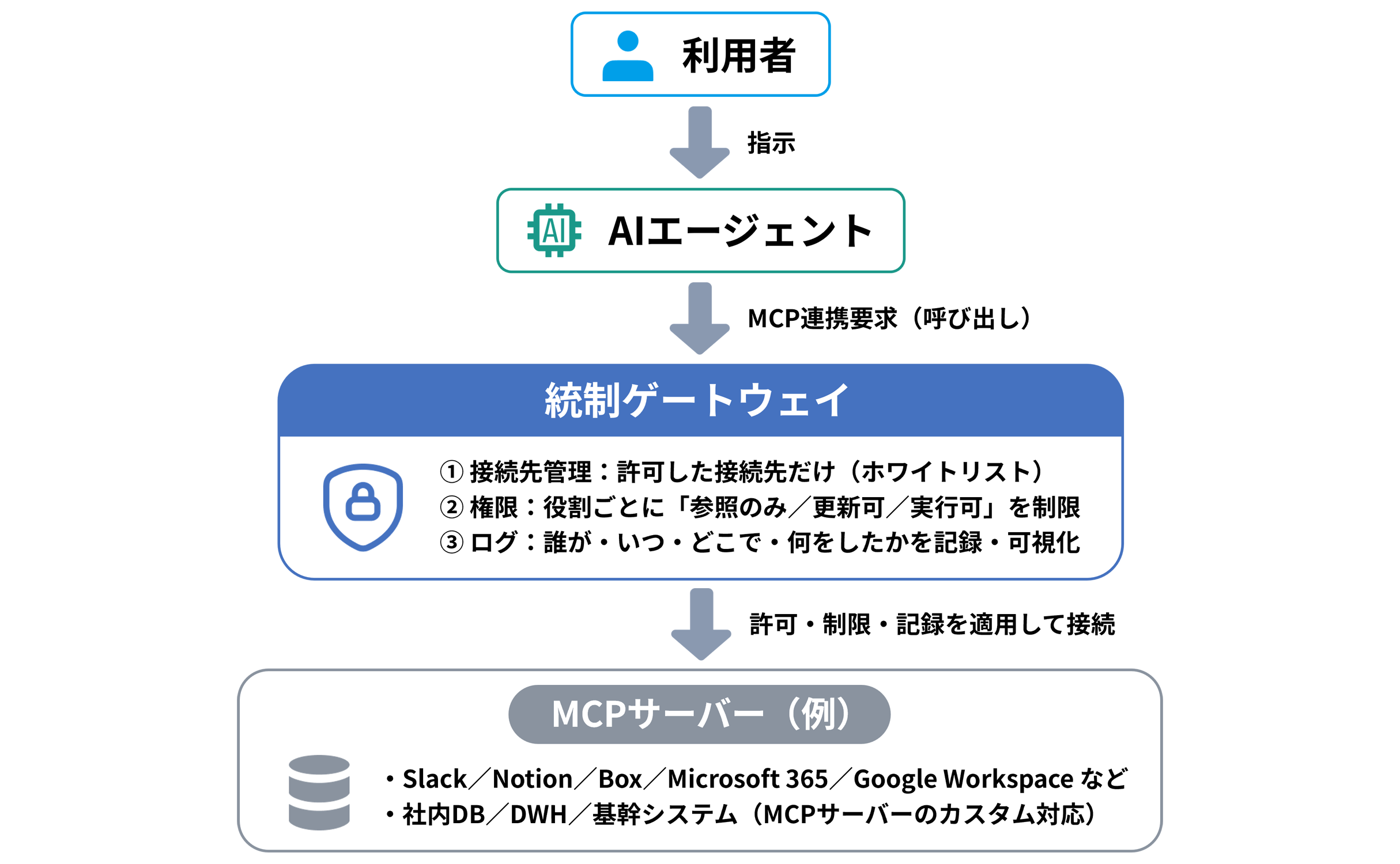 MCPサーバーが提供する機能やデータに対して、「参照のみ/更新可/実行可」といった操作範囲を、利用者の役割(部署・職種・担当業務)ごとに定義します。必要最小権限の範囲に絞ることで、権限の逸脱を防ぎます。
