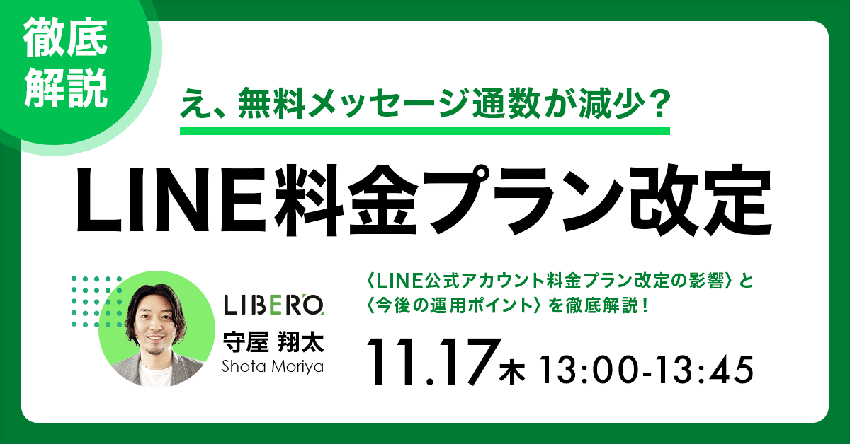 LINEマーケティングツール「LIBERO(リベロ)」を提供する株式会社ギブリー(本社:東京都渋谷区、代表取締役社長:井手高志、以下ギブリー)は、先日LINE株式会社より発表された「料金プランの改定」に伴い、〈料金プラン改定後の影響〉と〈今後の運用ポイント〉について解説する無料オンラインセミナーを2022年11月17日(木)に開催いたします。