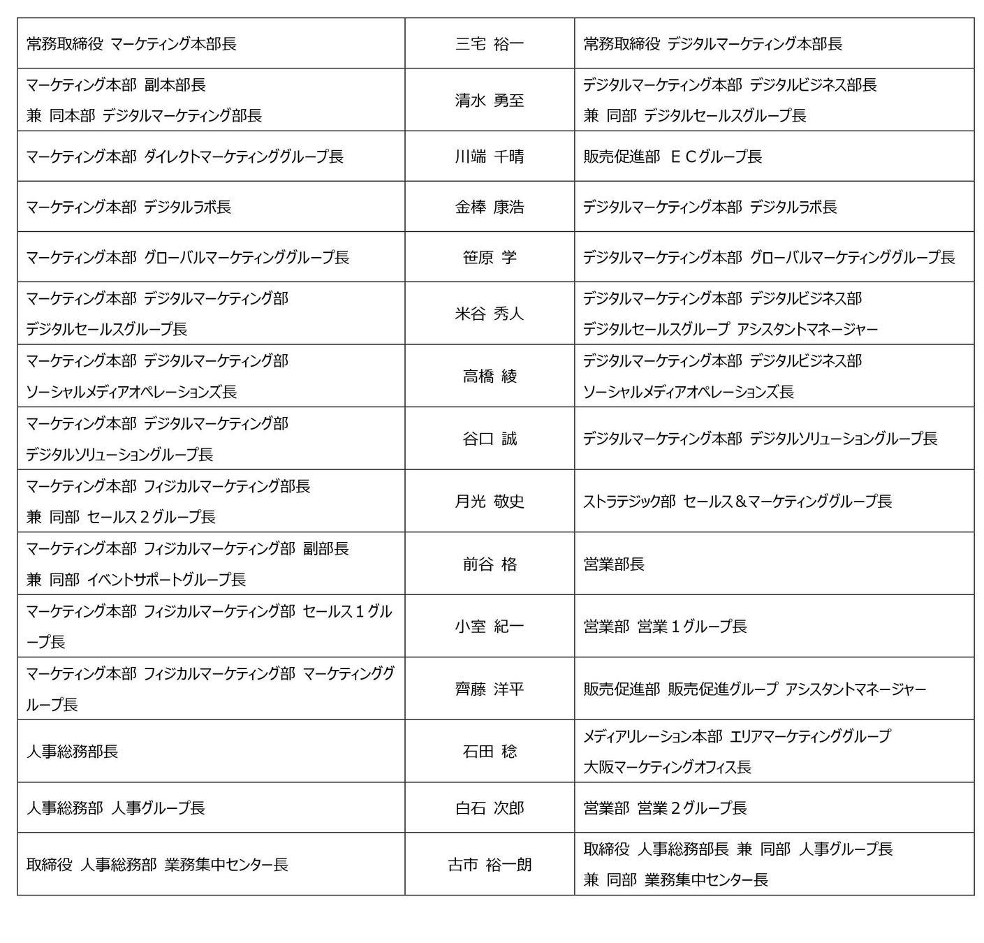 旧デジタルマーケティング本部、営業部、販売促進部ならびに旧ストラテジック部 セールス&マーケティンググループの機能を統合し、デジタルマーケティング部、フィジカルマーケティング部に再編する。