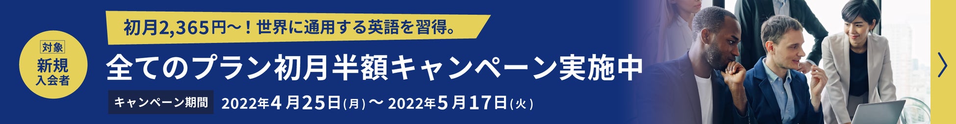 株式会社アンフープ(所在地:静岡県富士市、代表取締役社長:重森 渉)がサイト運営する、ビジネスに特化したビジネスオンライン英会話「HanasoBiz」では、2022年4月25日(月) ~5月17日(火)に、個人でお申し込みいただき新規に入会した方を対象として全てのプラン初月月額料金(4,730円~16,830円)(税込)が半額の「全てのプラン初月無料キャンペーン」を実施いたします。