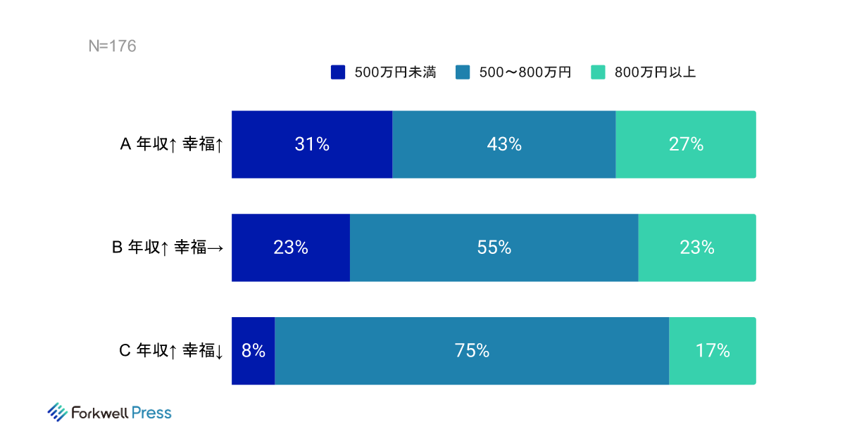 ・昇給額が年間100万円程度の場合、業務量やストレスが著しく増え、幸福度が下がる傾向