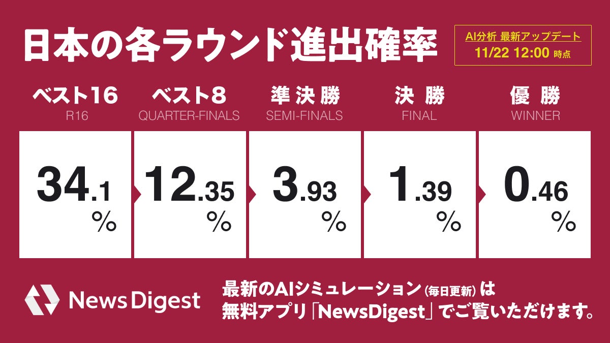 22日12時時点で、日本のグループリーグ突破確率は33.4%、優勝確率は0.5%となっています。わかりづらいサッカーの優劣も、数字に変換することで容易に理解できます。